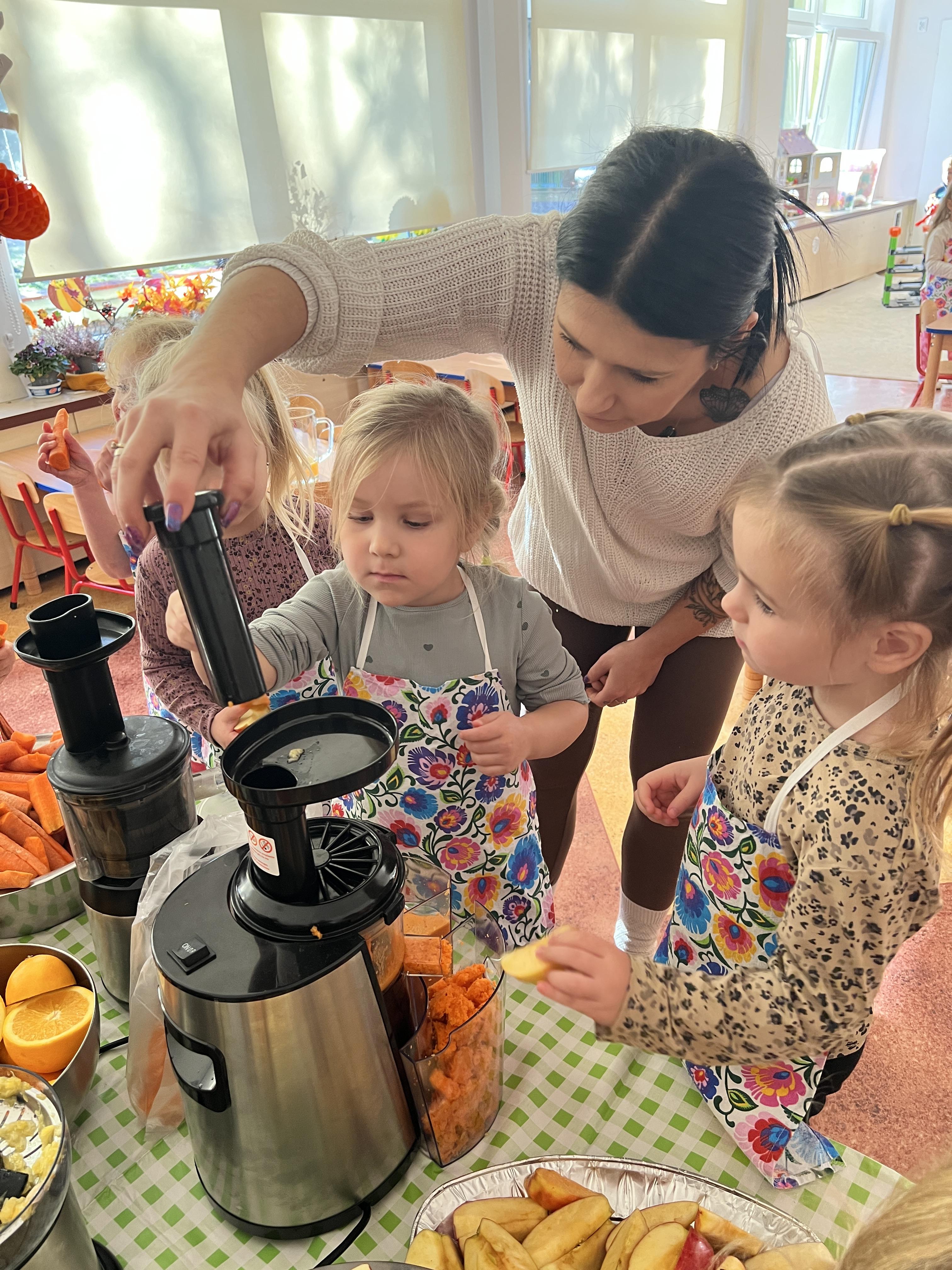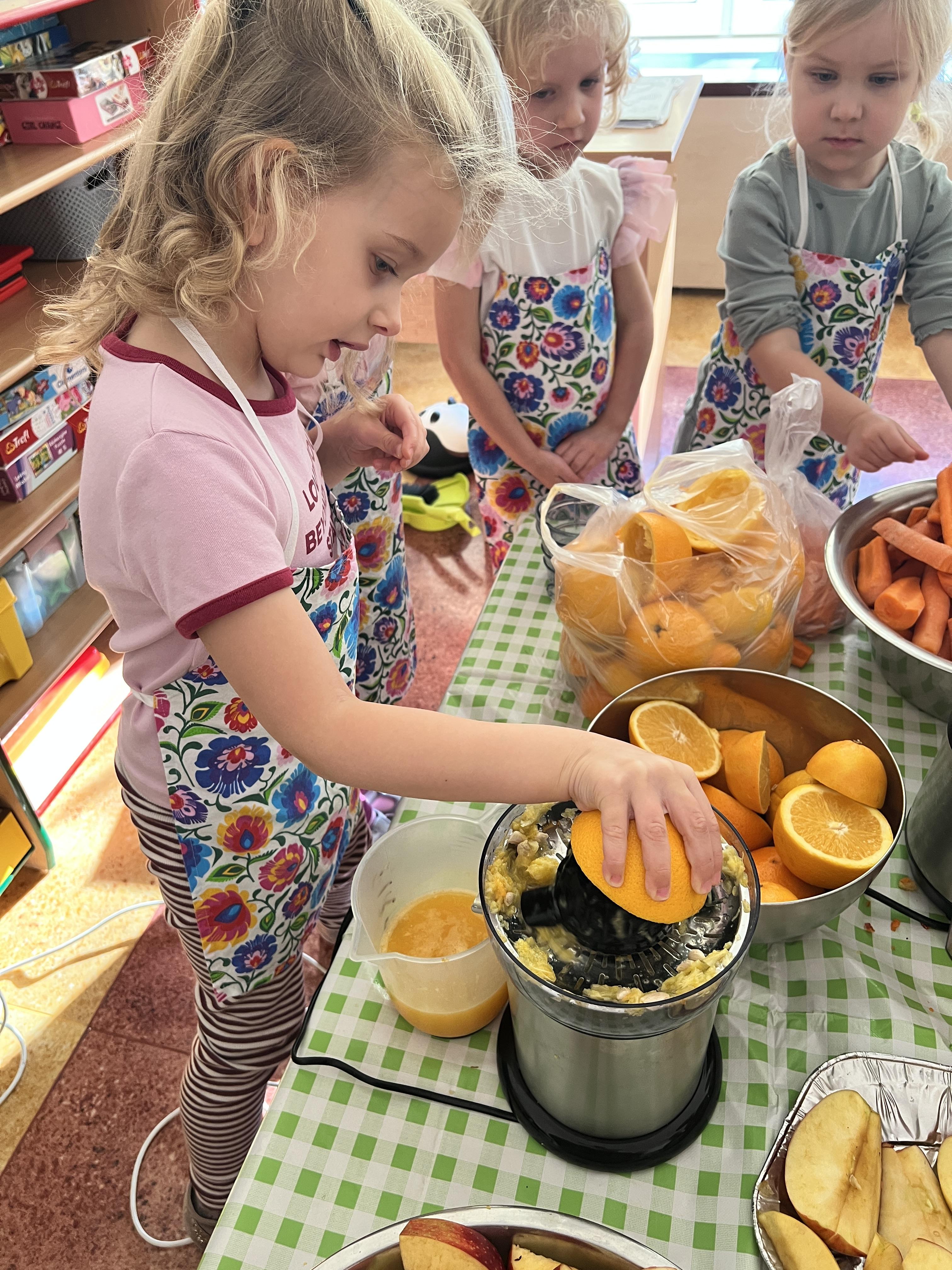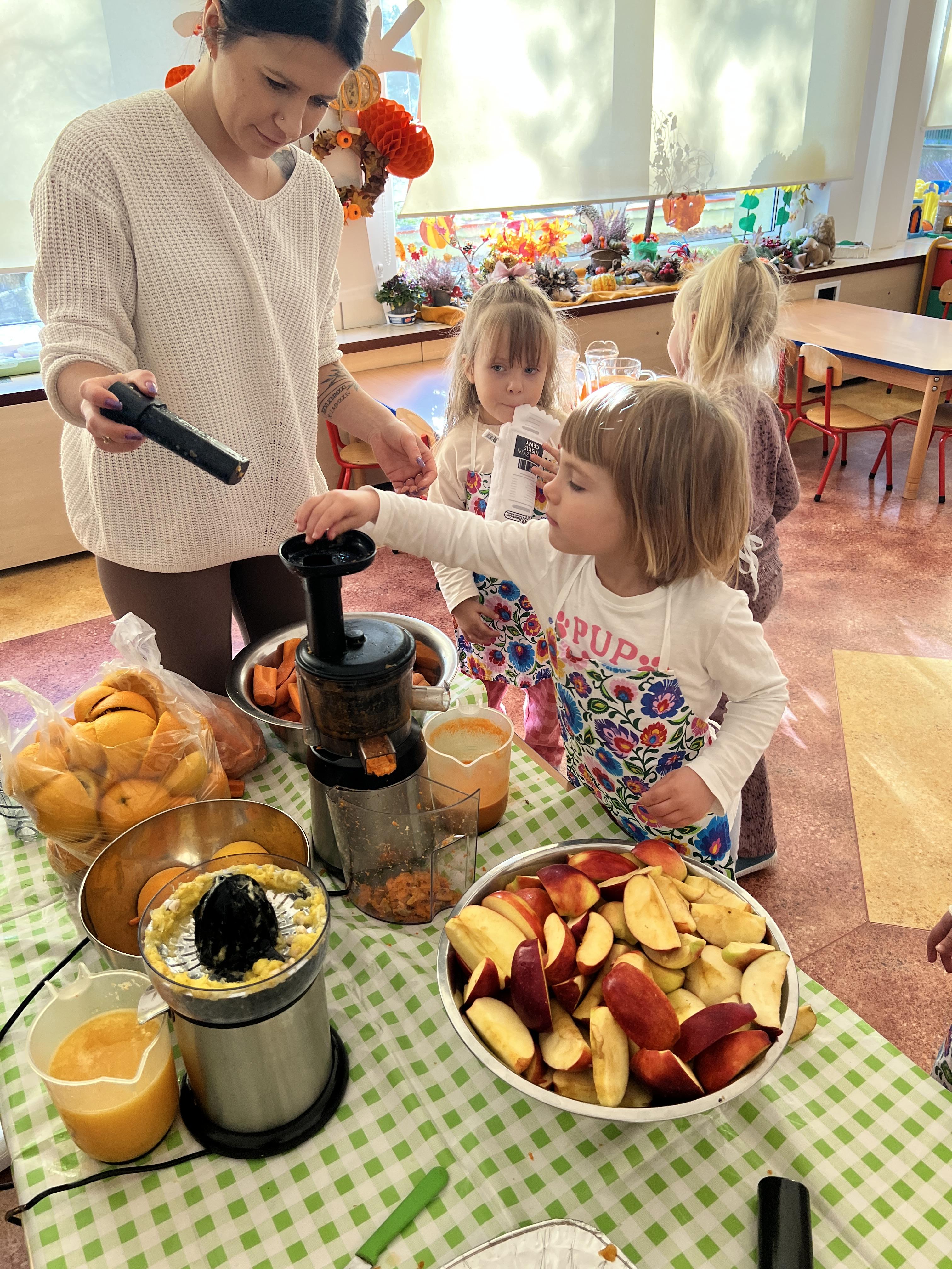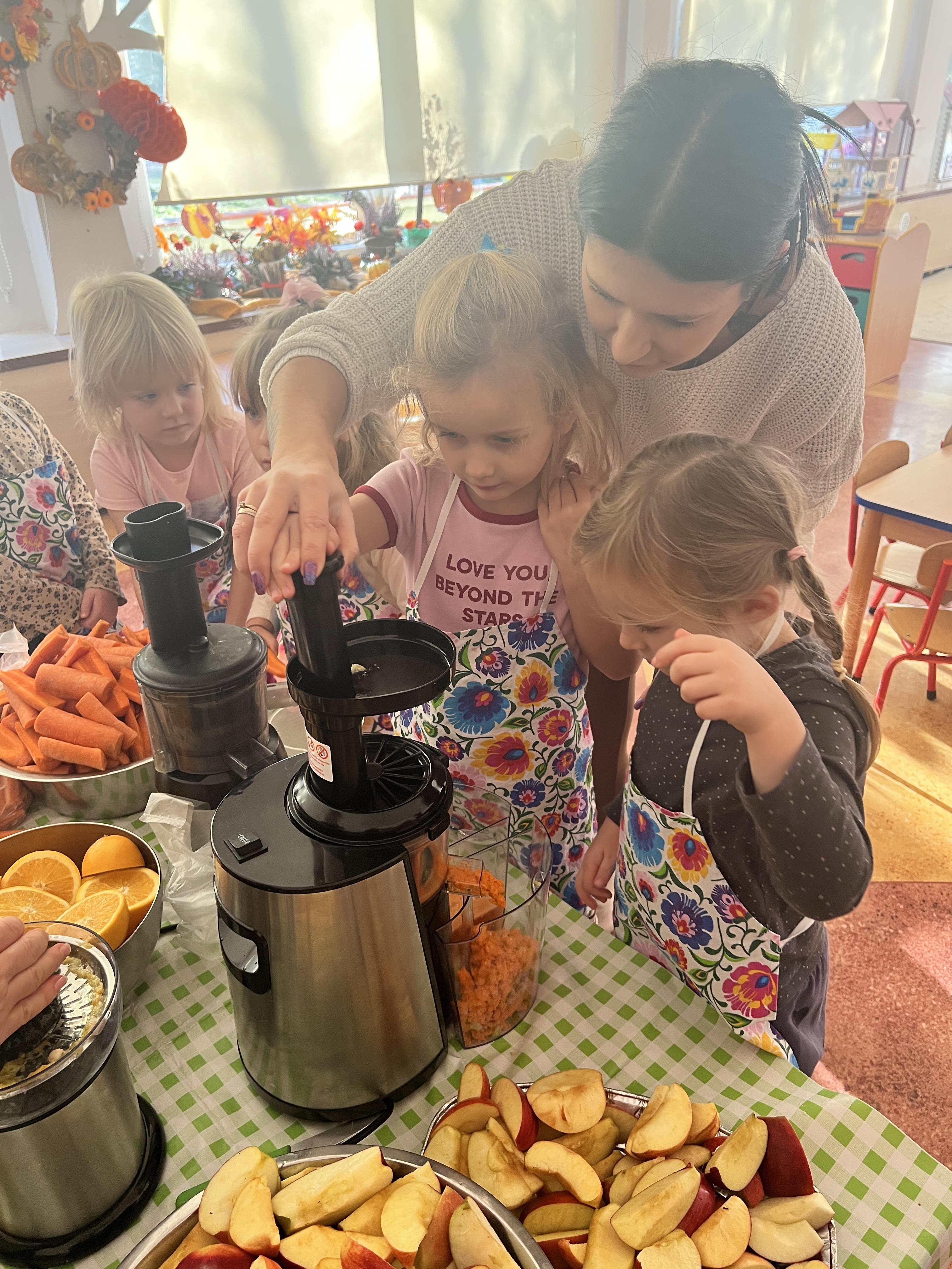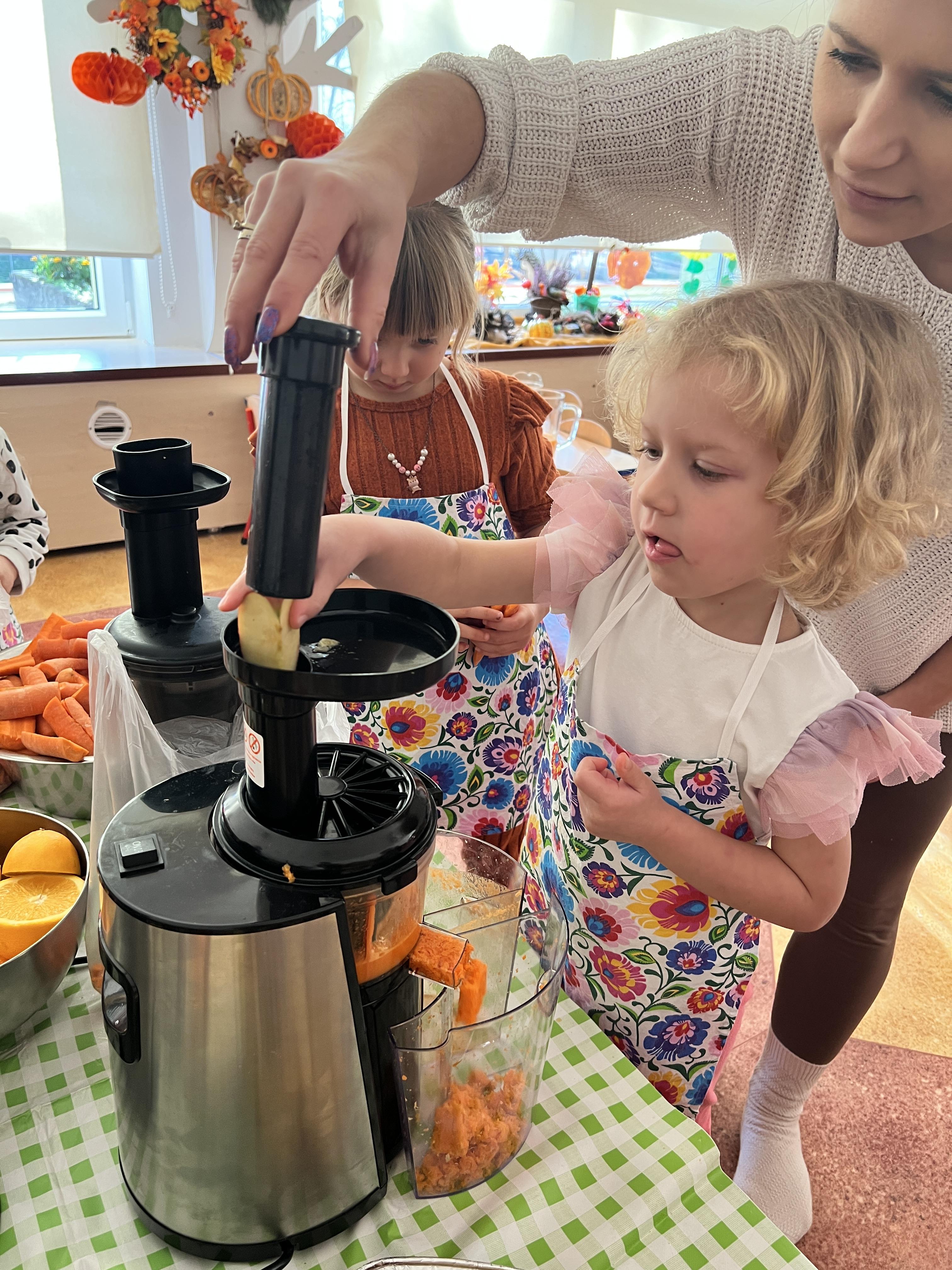Z myślą o pysznych witaminkach, postanowiliśy sprawdzić jak wyczarować pyszny sok z owoców bez dodatku cukru i konserwantów. Jednak zanim przystąpiliśmy do pracy, przedszkolaki zapoznały się z urządzeniem do robienia soku – sokowirówką, jego działaniem oraz utrwaliły podstawowe zasady higieny i bezpieczeństwa. Następnie dzieci samodzielnie wyciskały sok. Po skończonej pracy delektowały się jego smakiem. Bardzo dziękujemy mamie Mai za wspólnie spędzony czas. Zachęcamy i zapraszamy wszystkich rodziców do odwiedzin