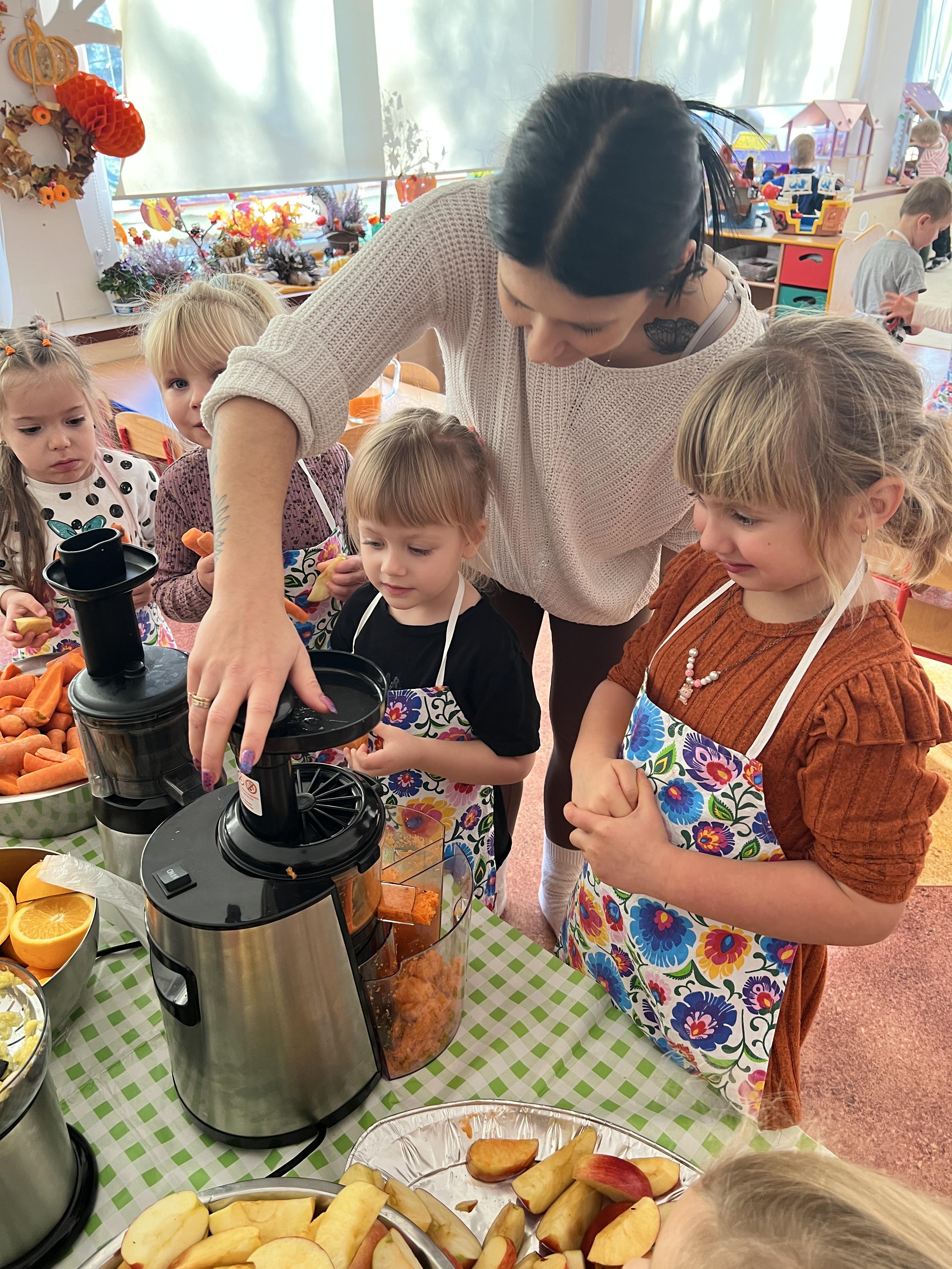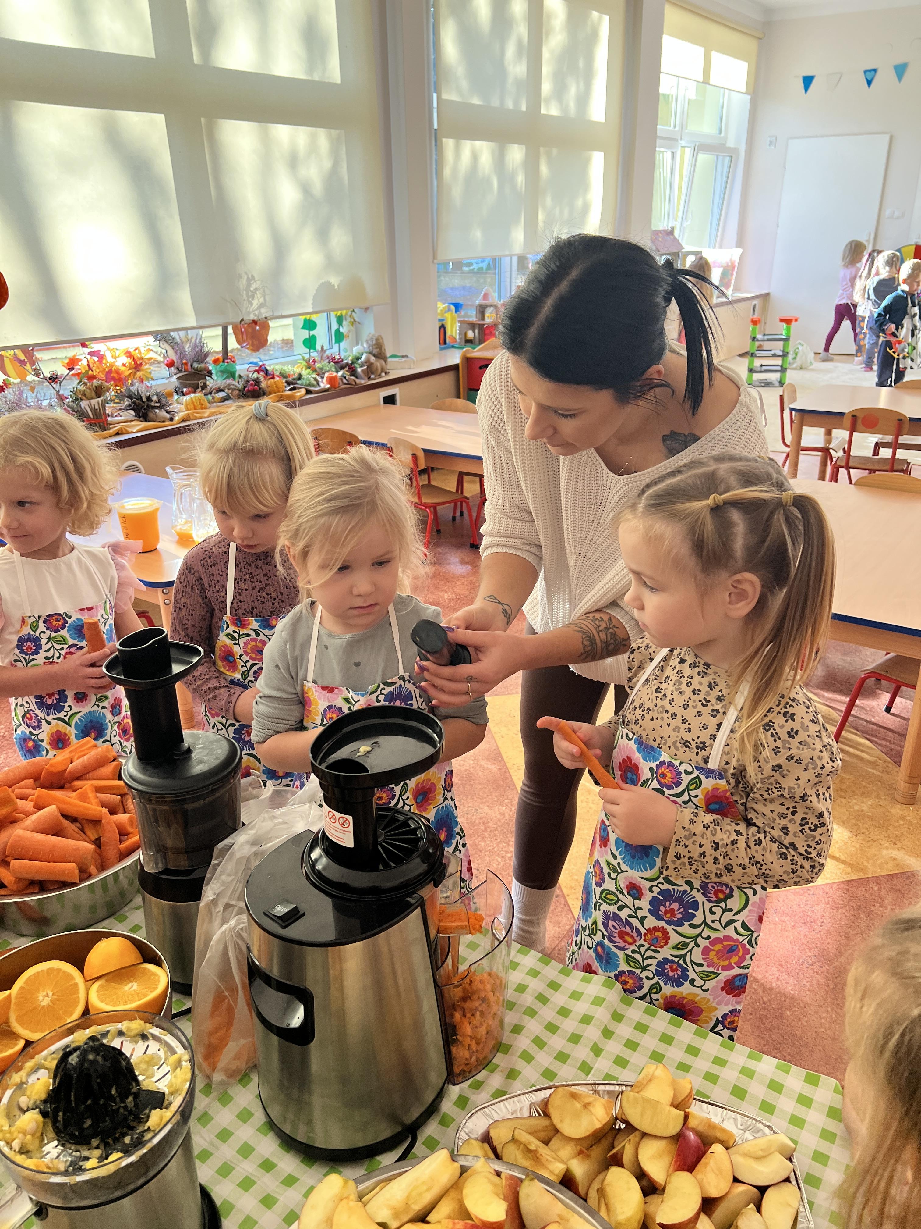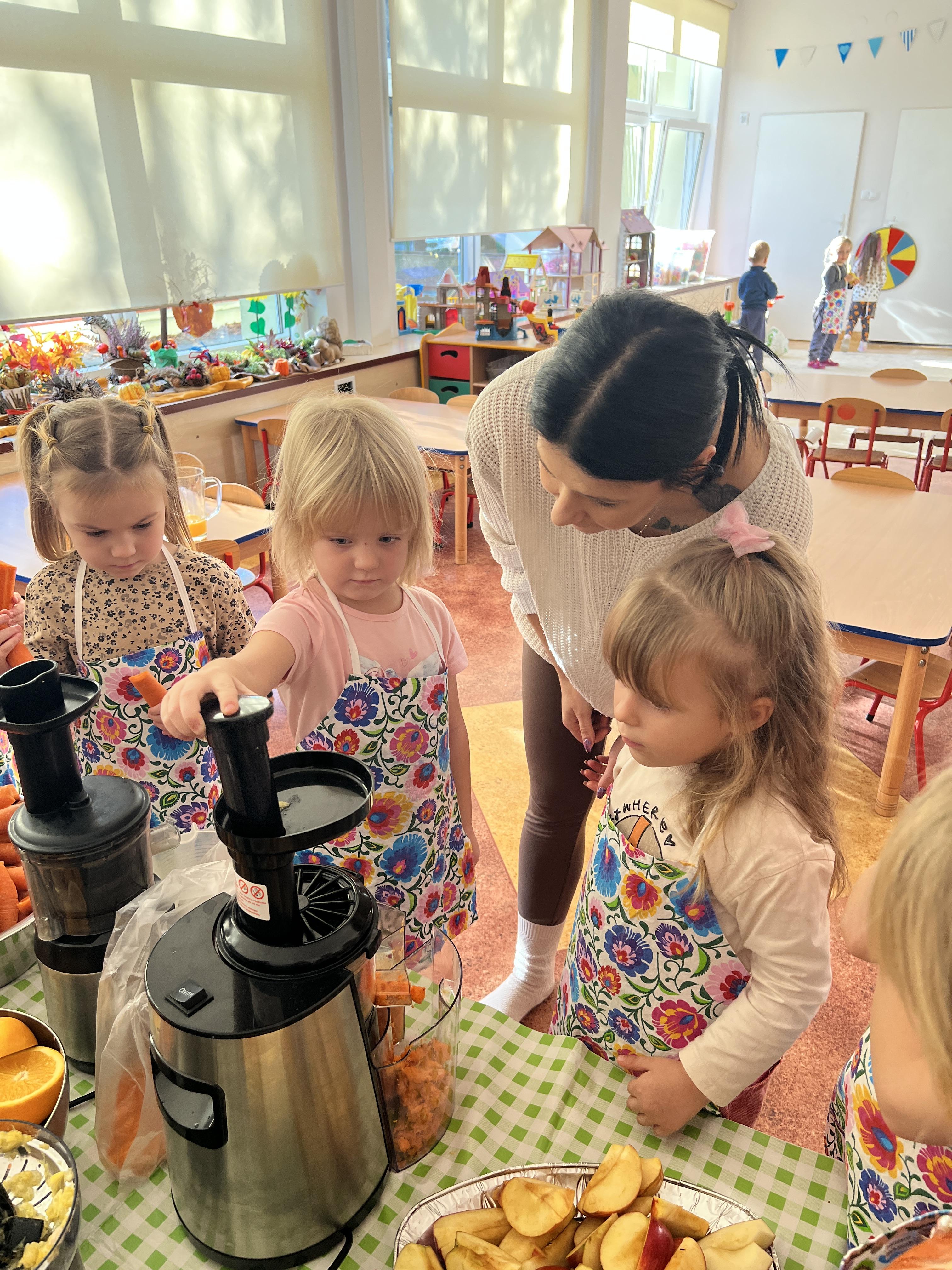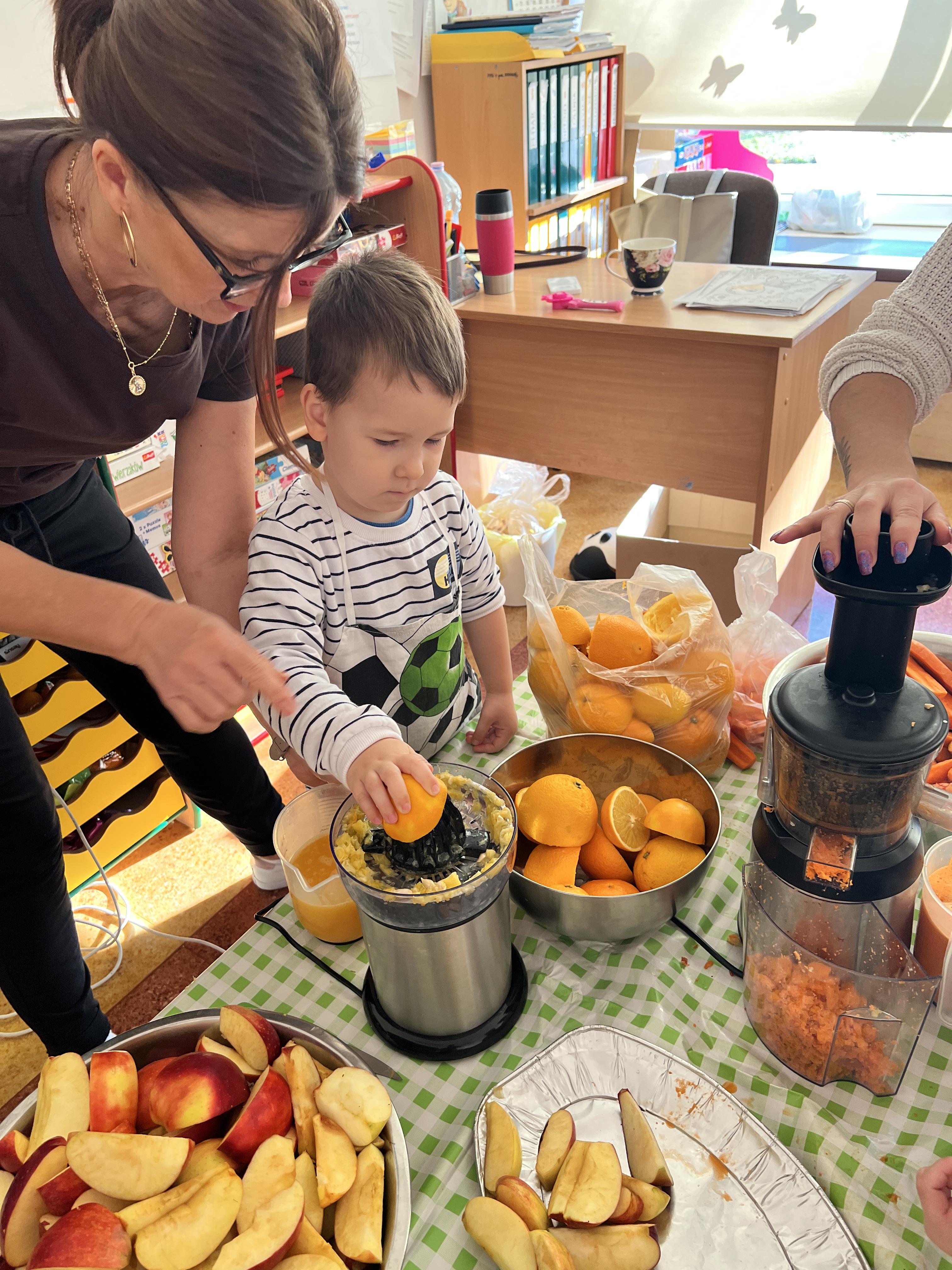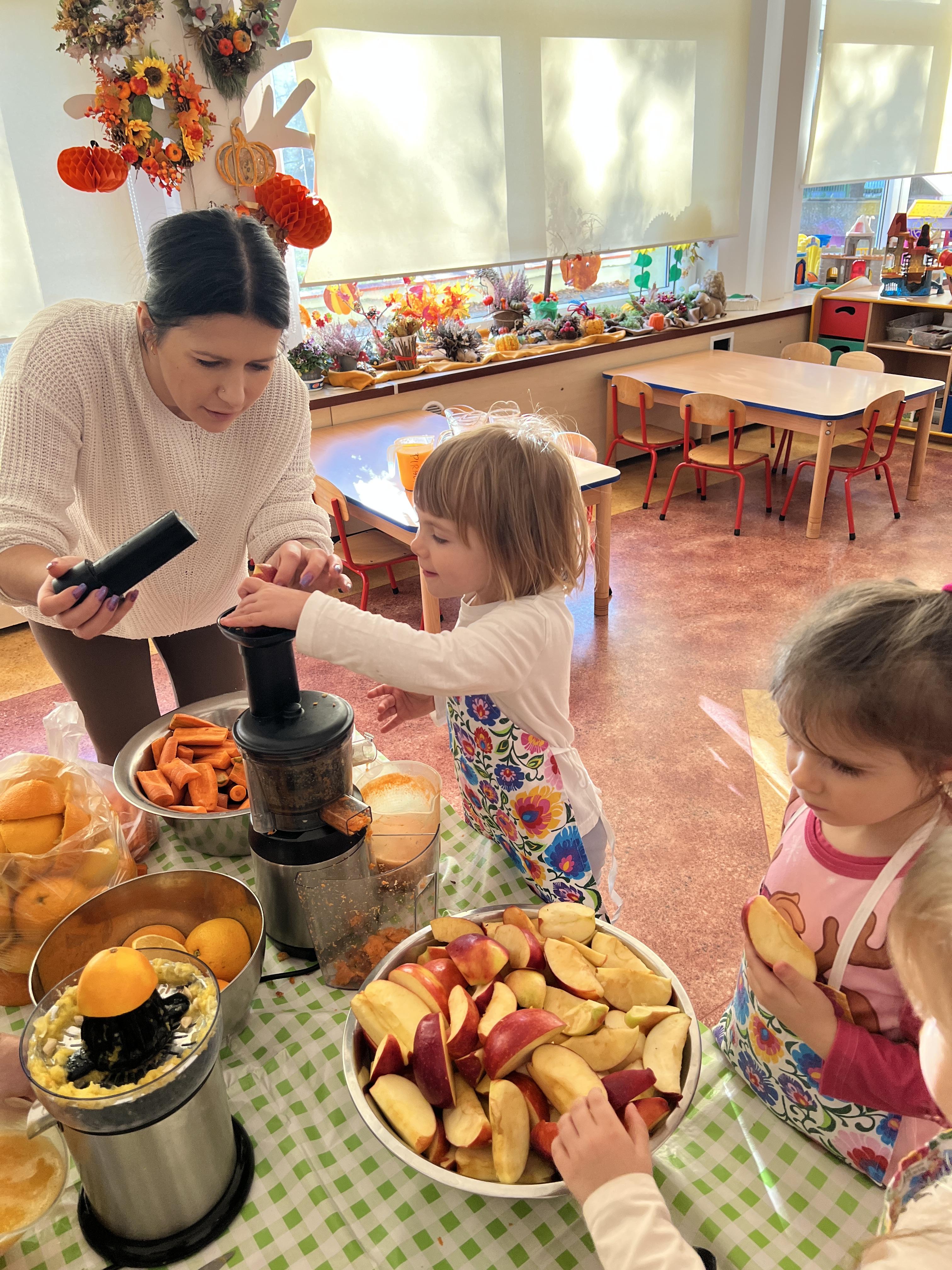 Z myślą o pysznych witaminkach, postanowiliśy sprawdzić jak wyczarować pyszny sok z owoców bez dodatku cukru i konserwantów. Jednak zanim przystąpiliśmy do pracy, przedszkolaki zapoznały się z urządzeniem do robienia soku – sokowirówką, jego działaniem oraz utrwaliły podstawowe zasady higieny i bezpieczeństwa. Następnie dzieci samodzielnie wyciskały sok. Po skończonej pracy delektowały się jego smakiem. Bardzo dziękujemy mamie Mai za wspólnie spędzony czas. Zachęcamy i zapraszamy wszystkich rodziców do odwiedzin
