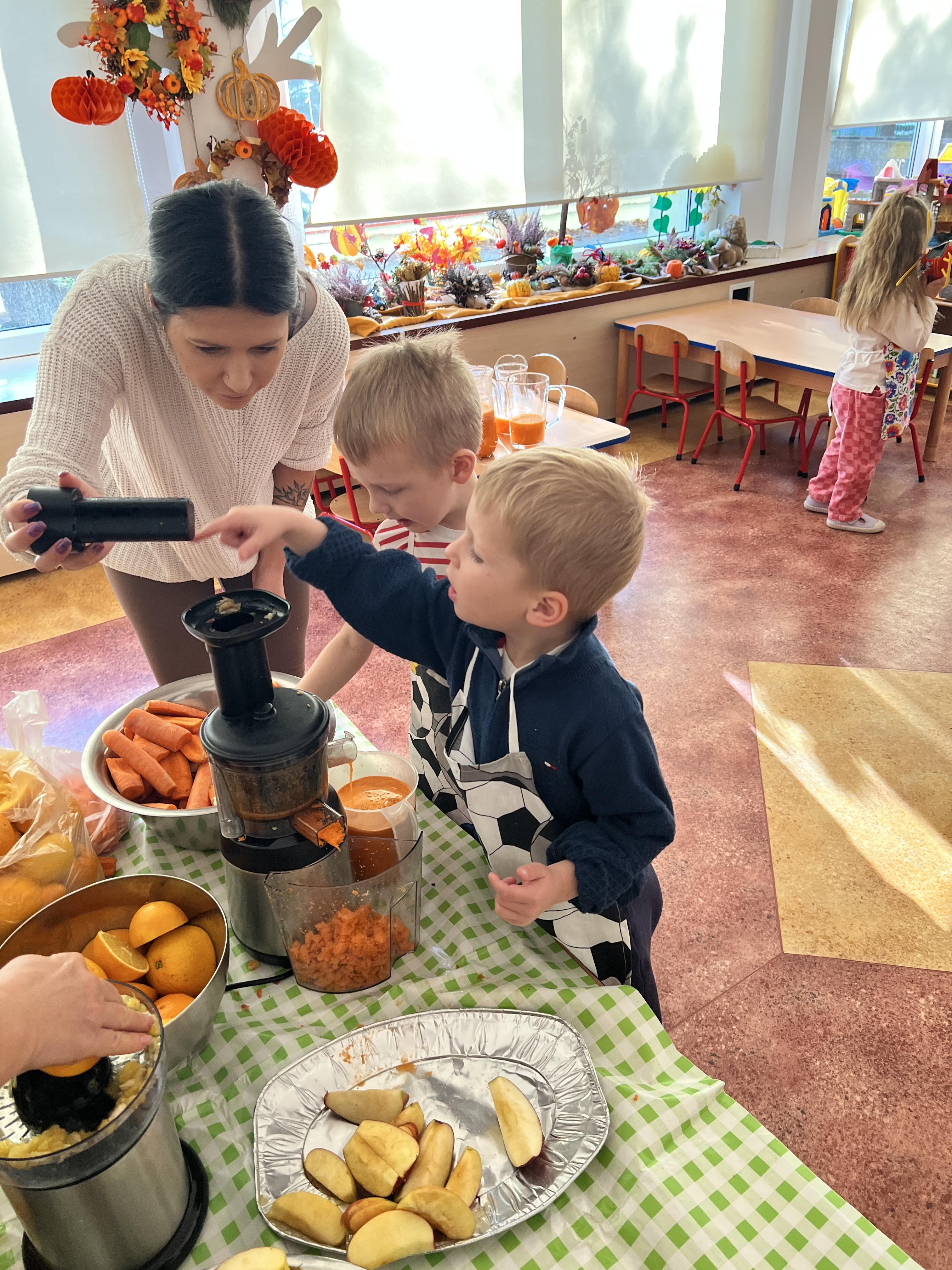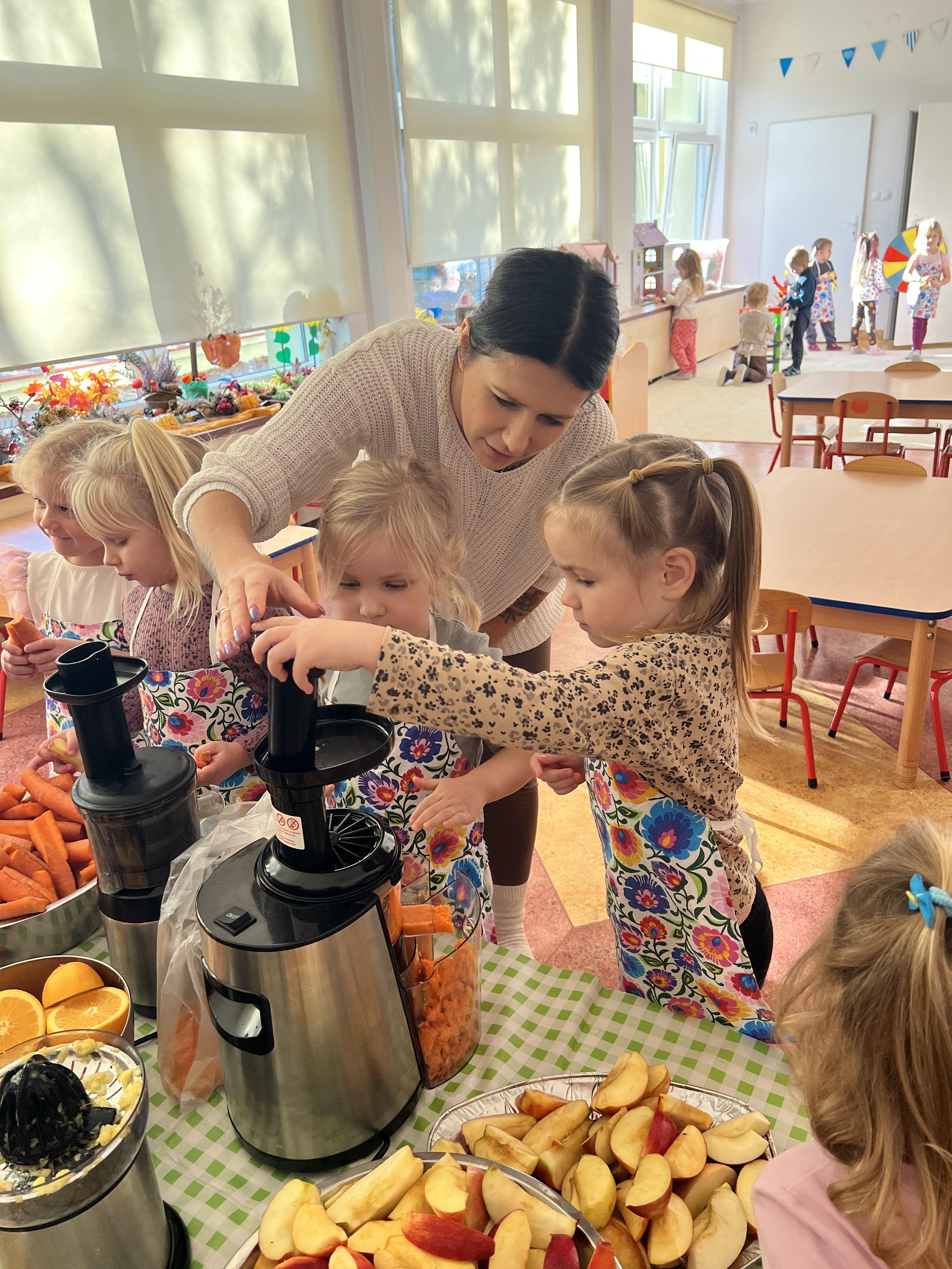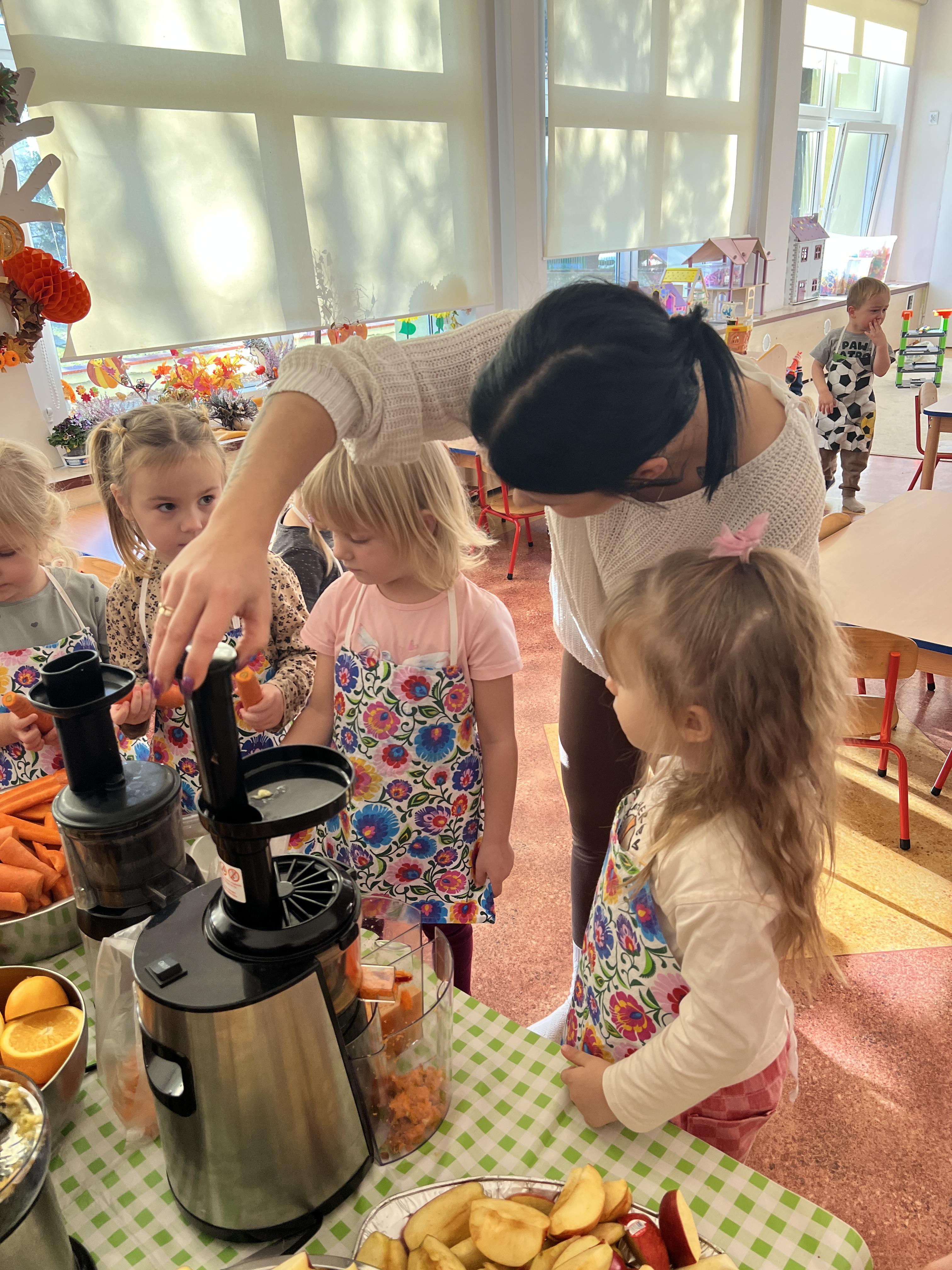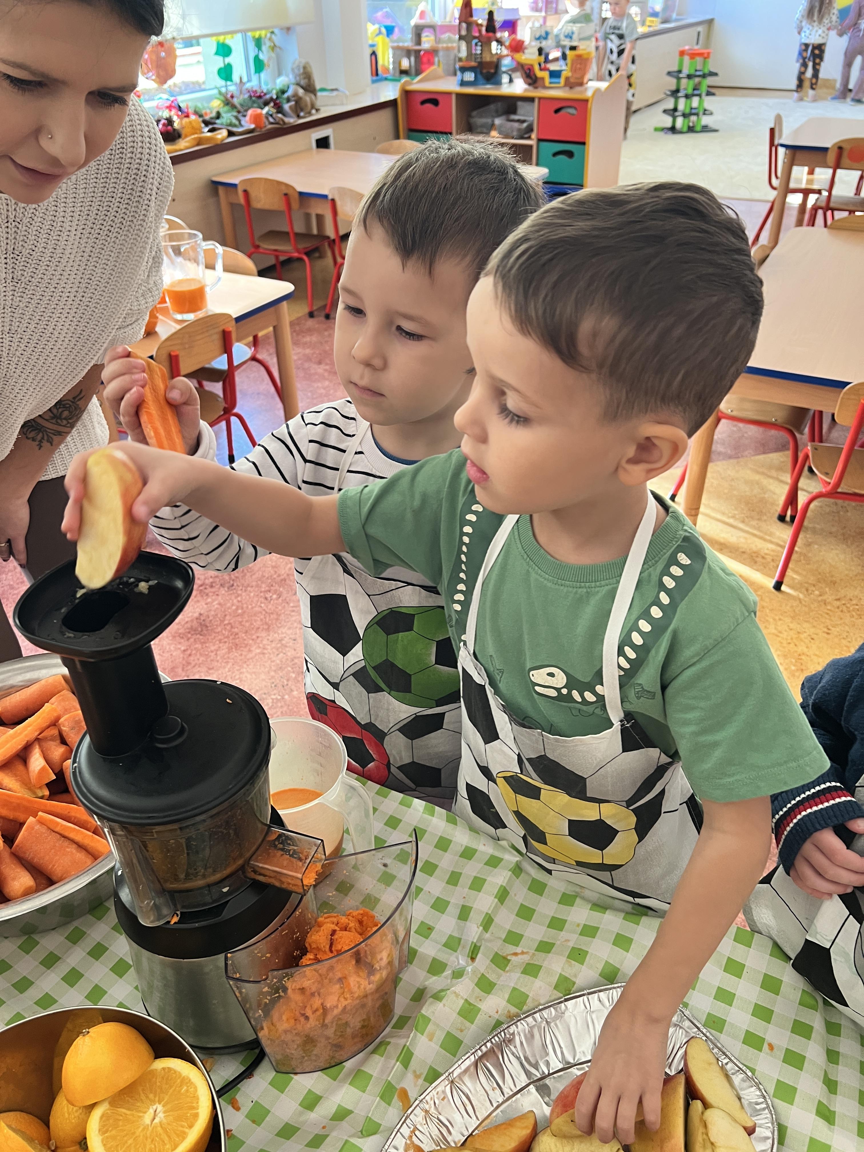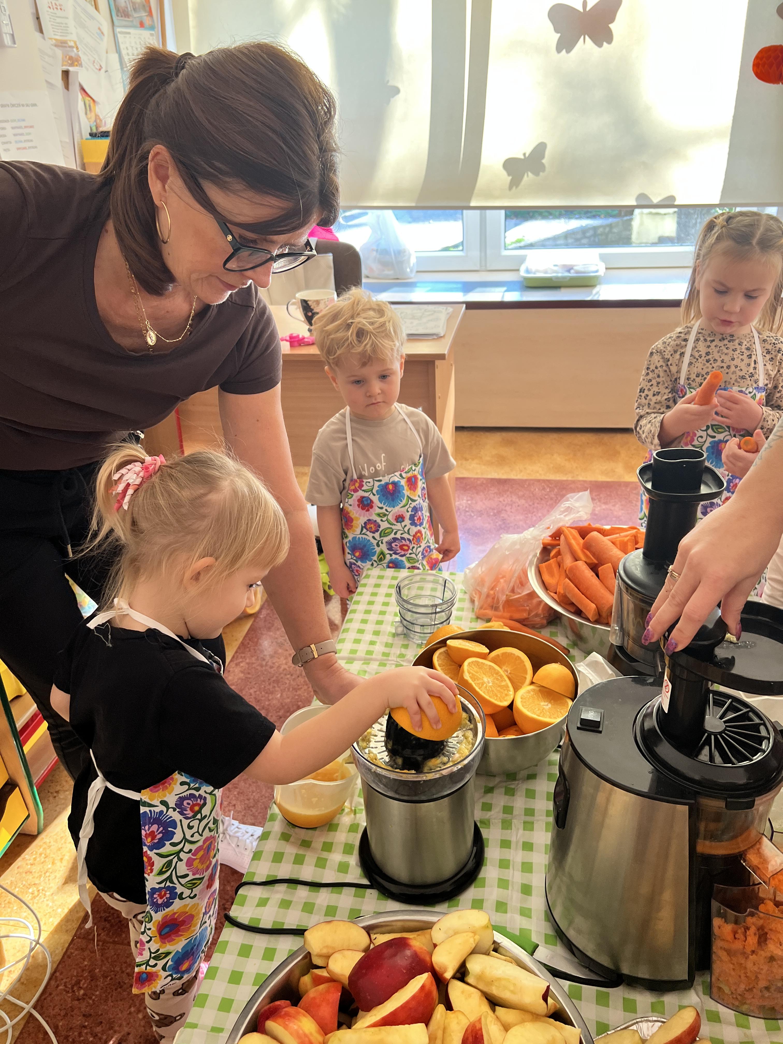 Z myślą o pysznych witaminkach, postanowiliśy sprawdzić jak wyczarować pyszny sok z owoców bez dodatku cukru i konserwantów. Jednak zanim przystąpiliśmy do pracy, przedszkolaki zapoznały się z urządzeniem do robienia soku – sokowirówką, jego działaniem oraz utrwaliły podstawowe zasady higieny i bezpieczeństwa. Następnie dzieci samodzielnie wyciskały sok. Po skończonej pracy delektowały się jego smakiem. Bardzo dziękujemy mamie Mai za wspólnie spędzony czas. Zachęcamy i zapraszamy wszystkich rodziców do odwiedzin