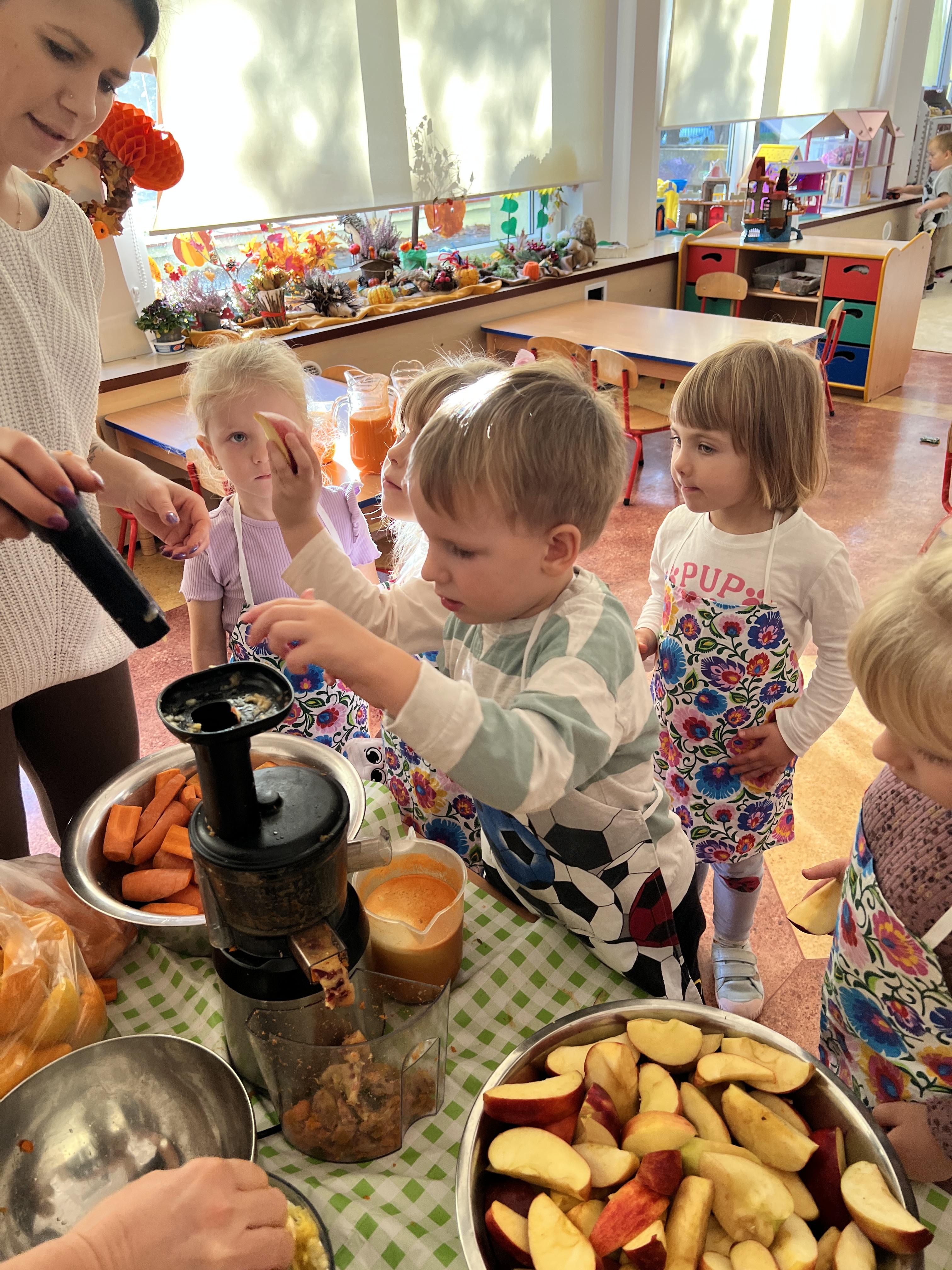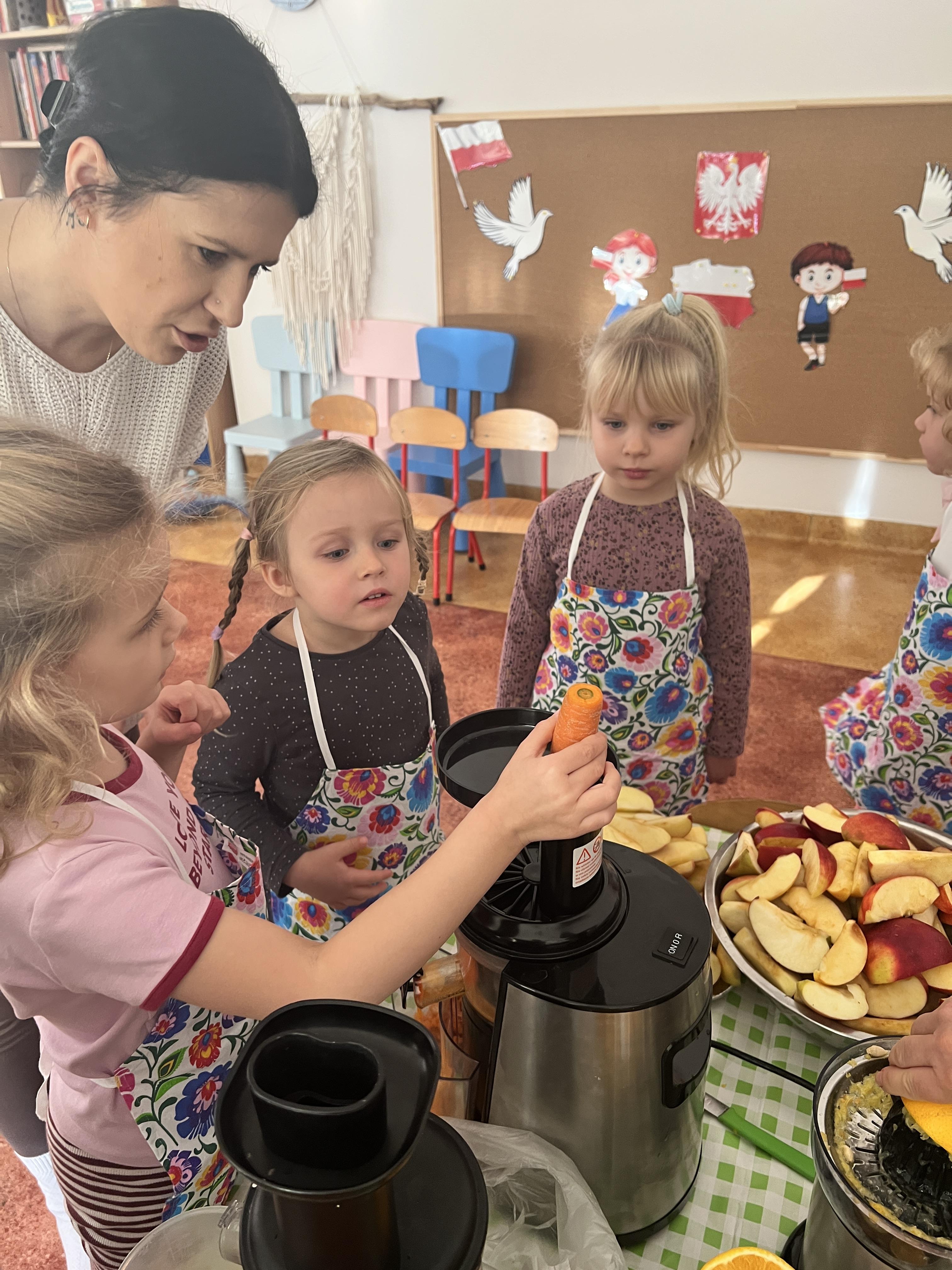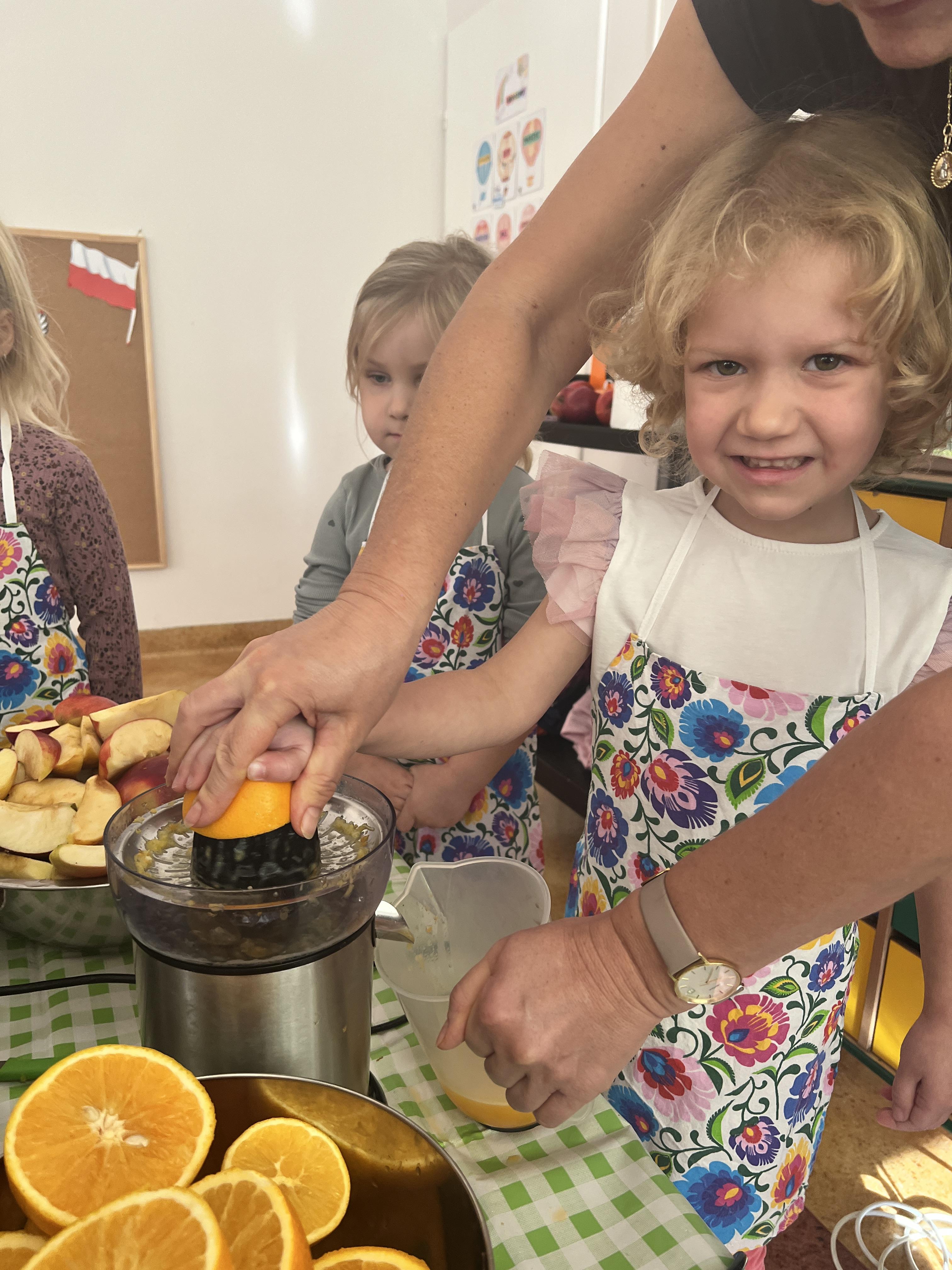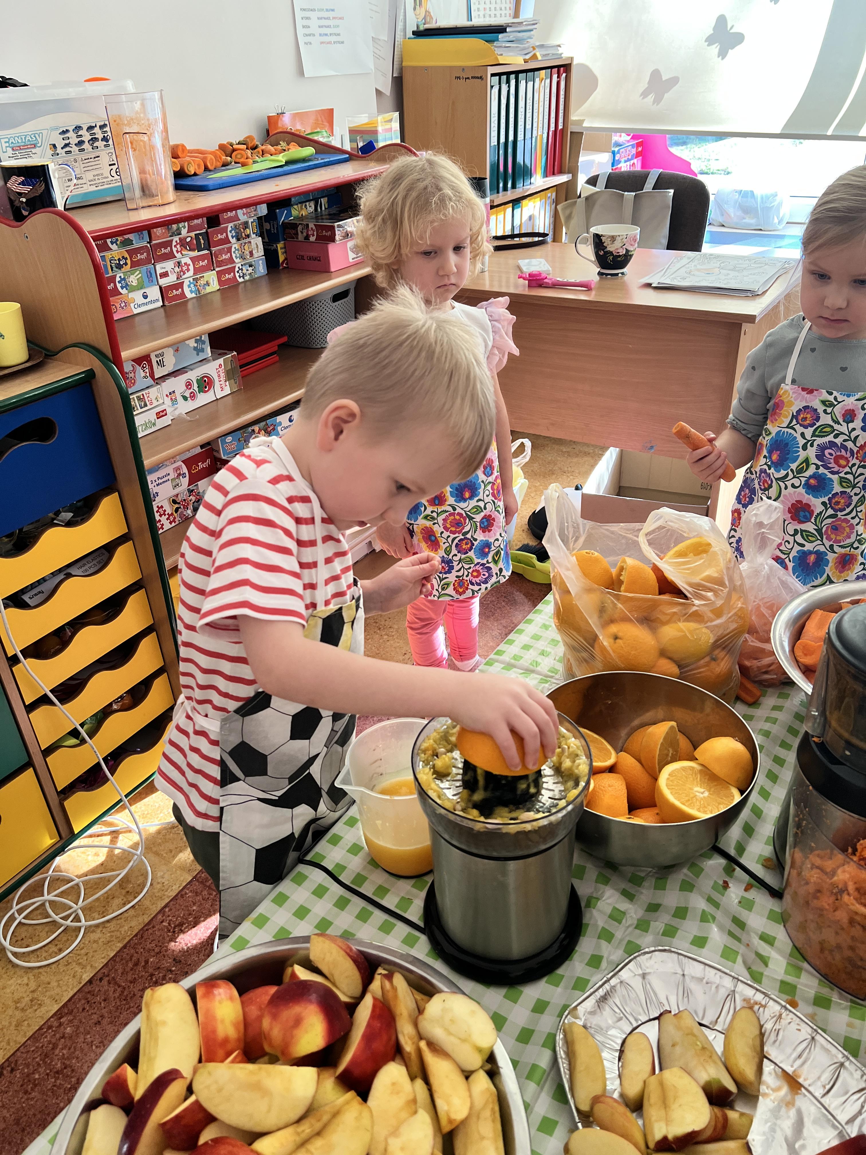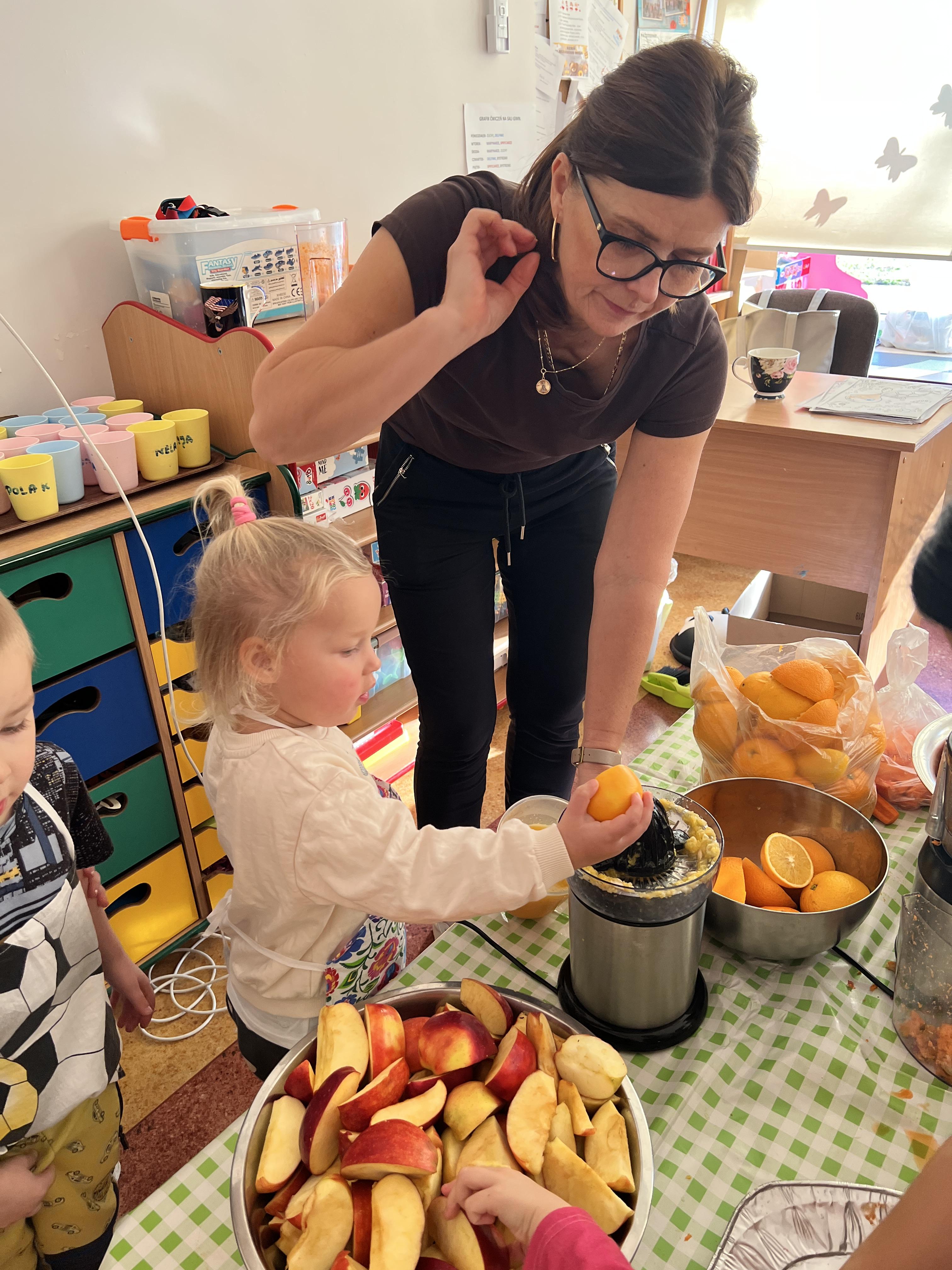 Z myślą o pysznych witaminkach, postanowiliśy sprawdzić jak wyczarować pyszny sok z owoców bez dodatku cukru i konserwantów. Jednak zanim przystąpiliśmy do pracy, przedszkolaki zapoznały się z urządzeniem do robienia soku – sokowirówką, jego działaniem oraz utrwaliły podstawowe zasady higieny i bezpieczeństwa. Następnie dzieci samodzielnie wyciskały sok. Po skończonej pracy delektowały się jego smakiem. Bardzo dziękujemy mamie Mai za wspólnie spędzony czas. Zachęcamy i zapraszamy wszystkich rodziców do odwiedzin
