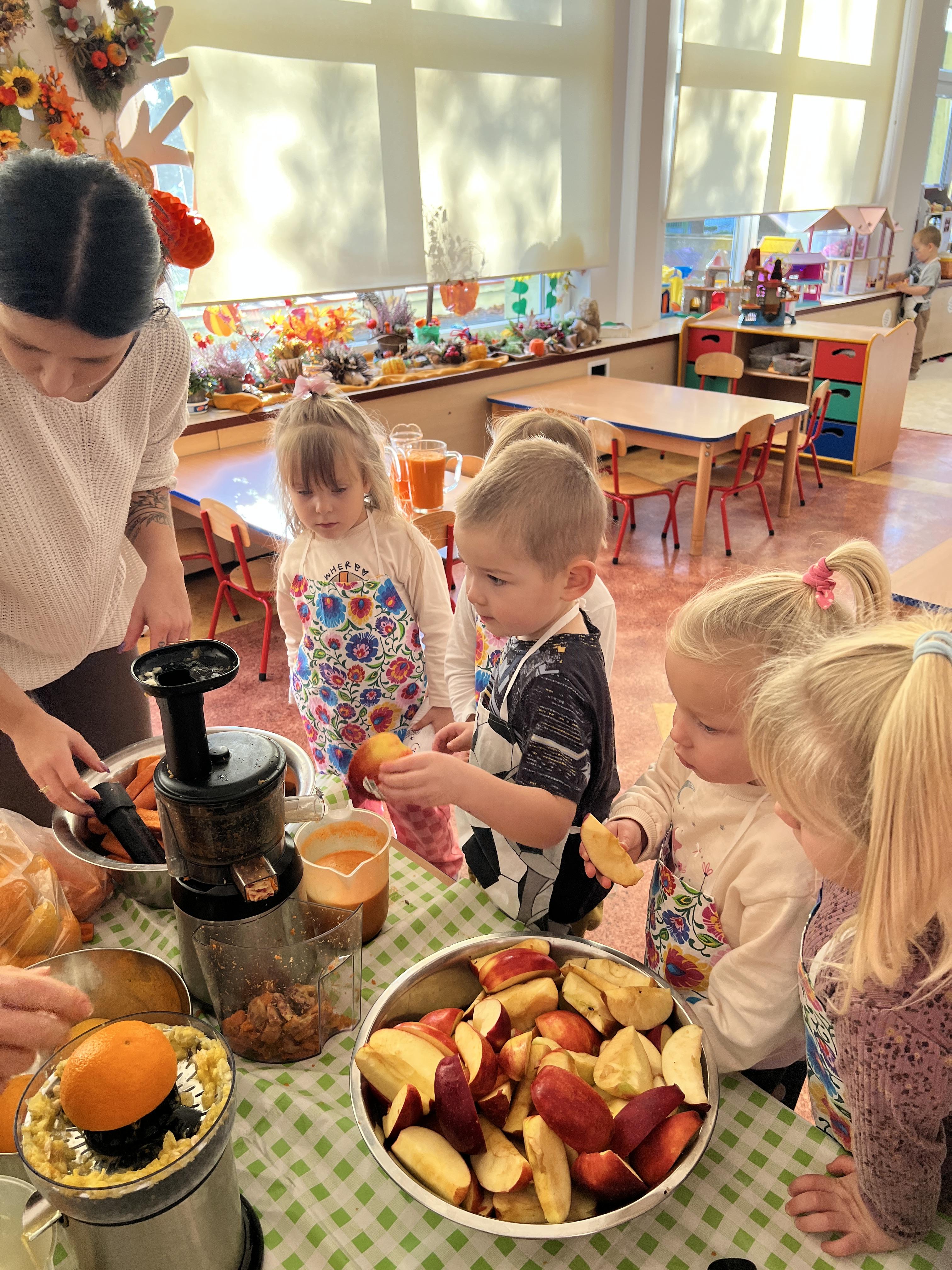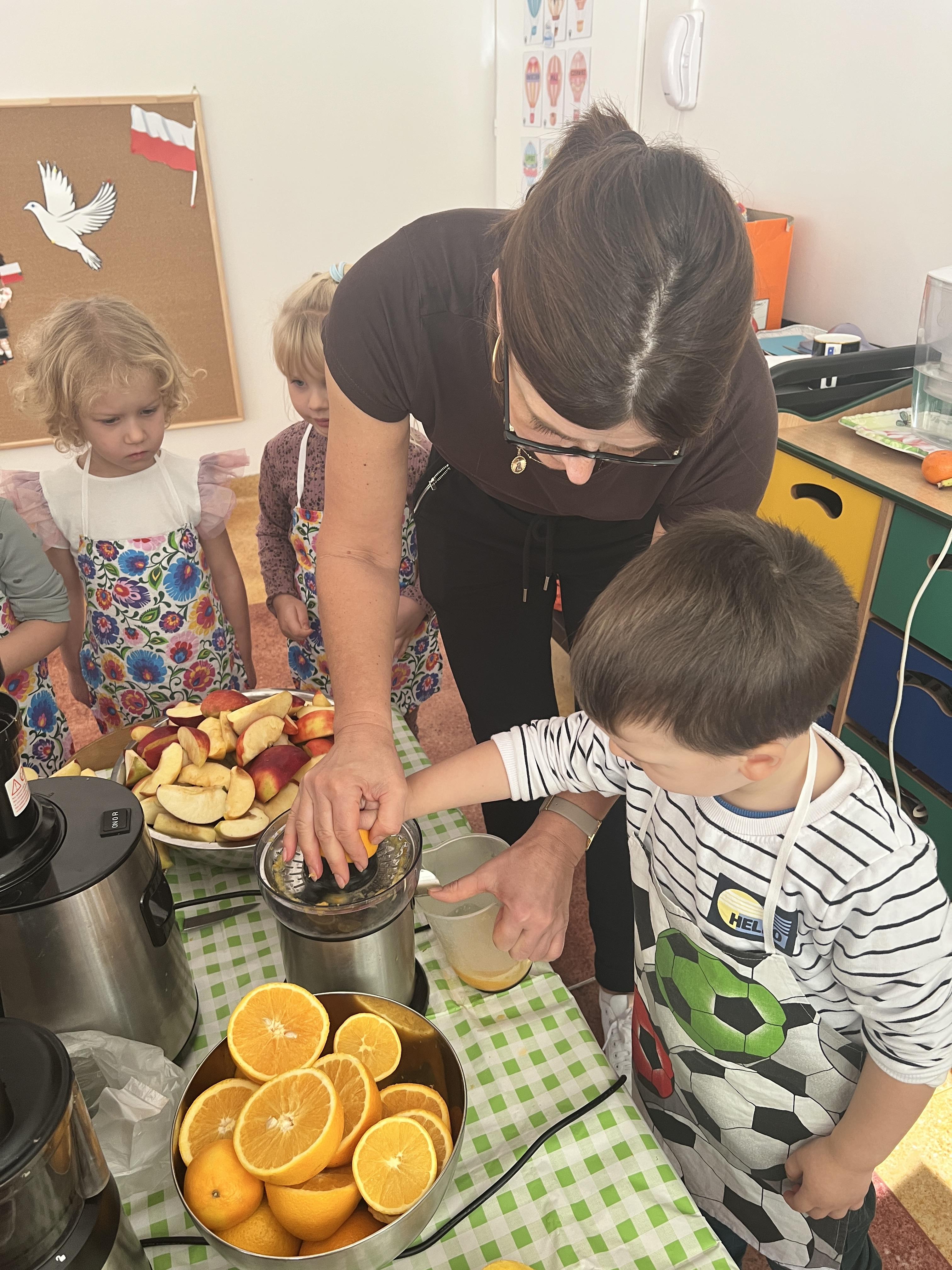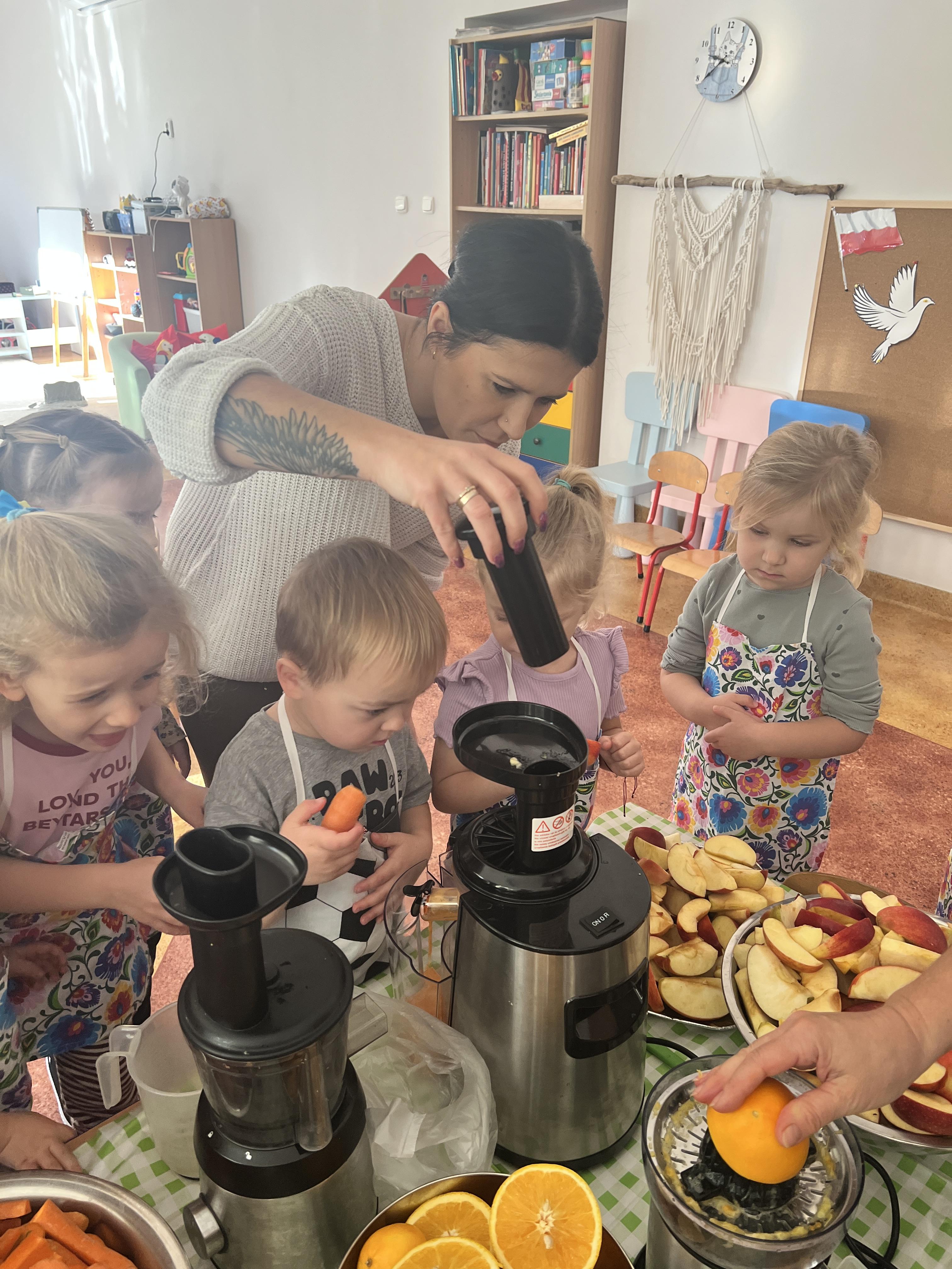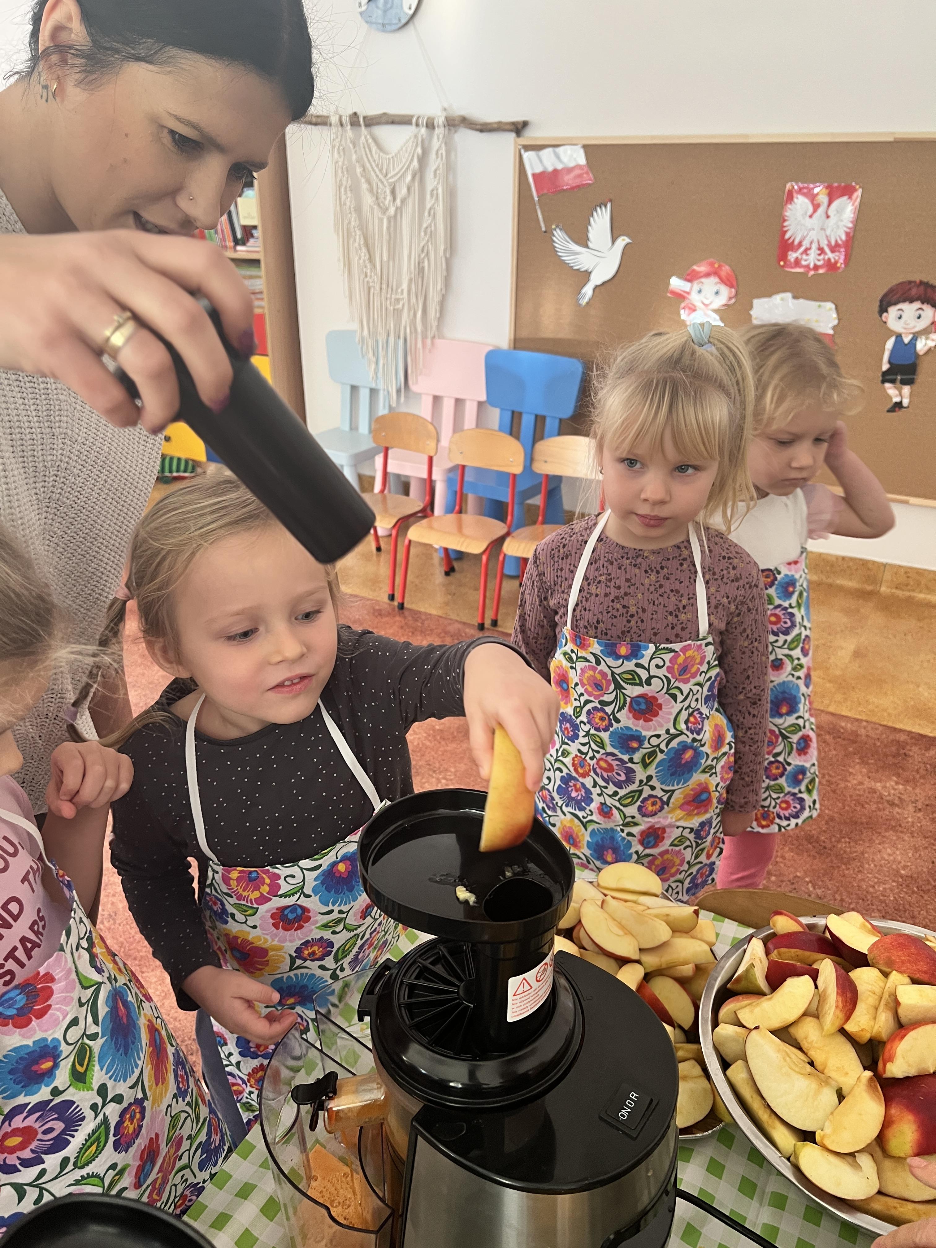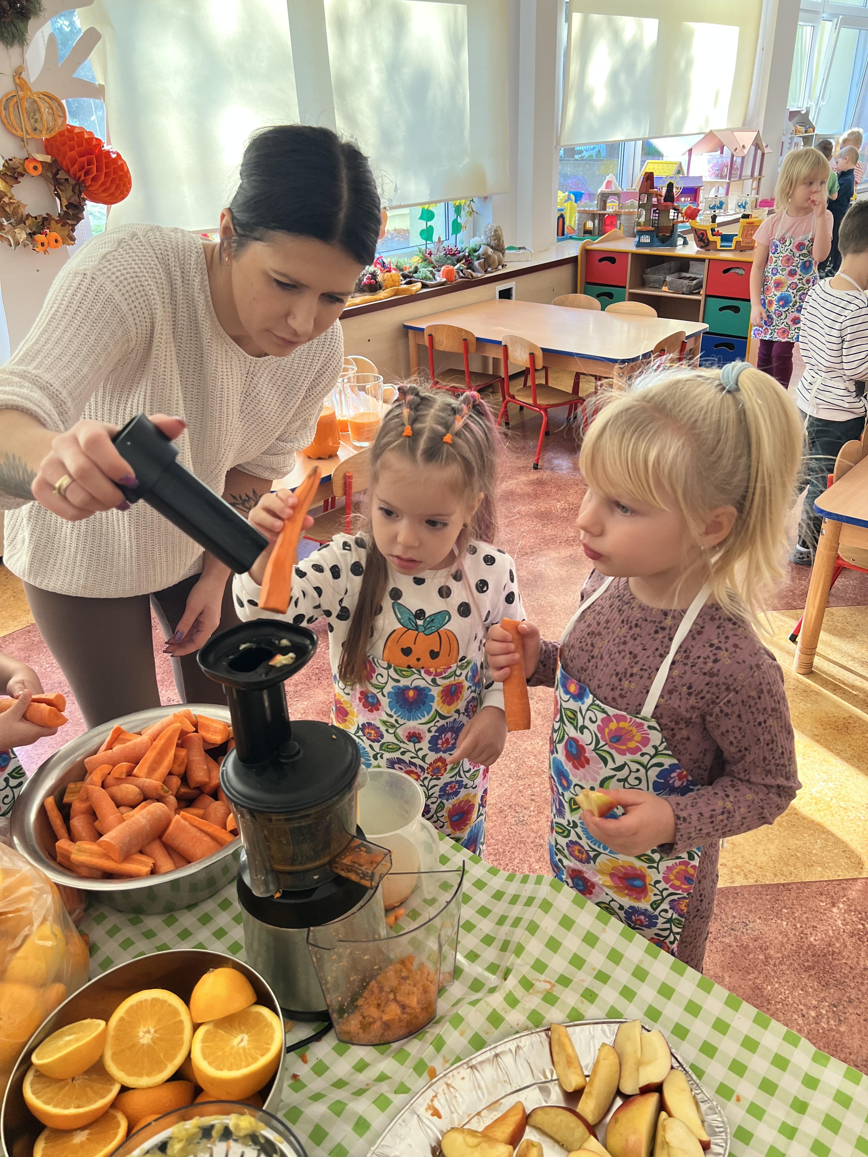 Z myślą o pysznych witaminkach, postanowiliśy sprawdzić jak wyczarować pyszny sok z owoców bez dodatku cukru i konserwantów. Jednak zanim przystąpiliśmy do pracy, przedszkolaki zapoznały się z urządzeniem do robienia soku – sokowirówką, jego działaniem oraz utrwaliły podstawowe zasady higieny i bezpieczeństwa. Następnie dzieci samodzielnie wyciskały sok. Po skończonej pracy delektowały się jego smakiem. Bardzo dziękujemy mamie Mai za wspólnie spędzony czas. Zachęcamy i zapraszamy wszystkich rodziców do odwiedzin