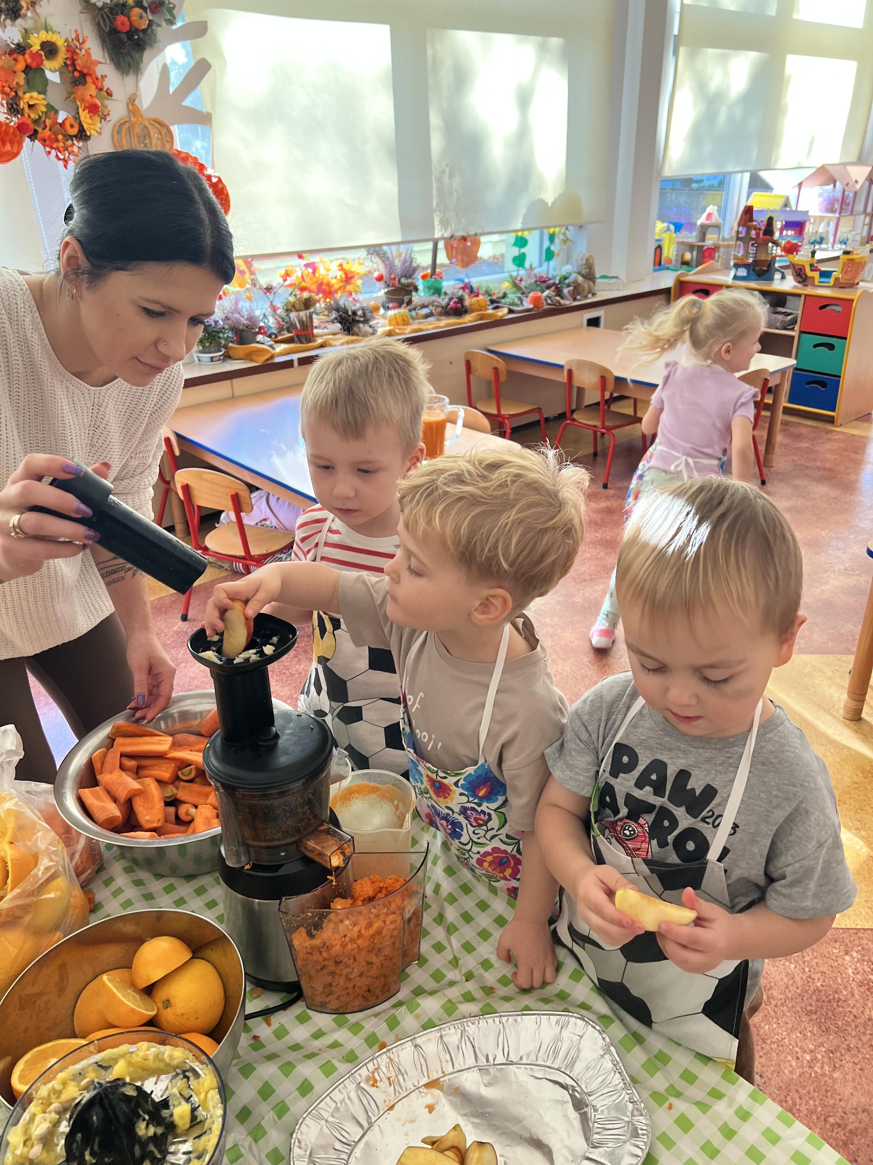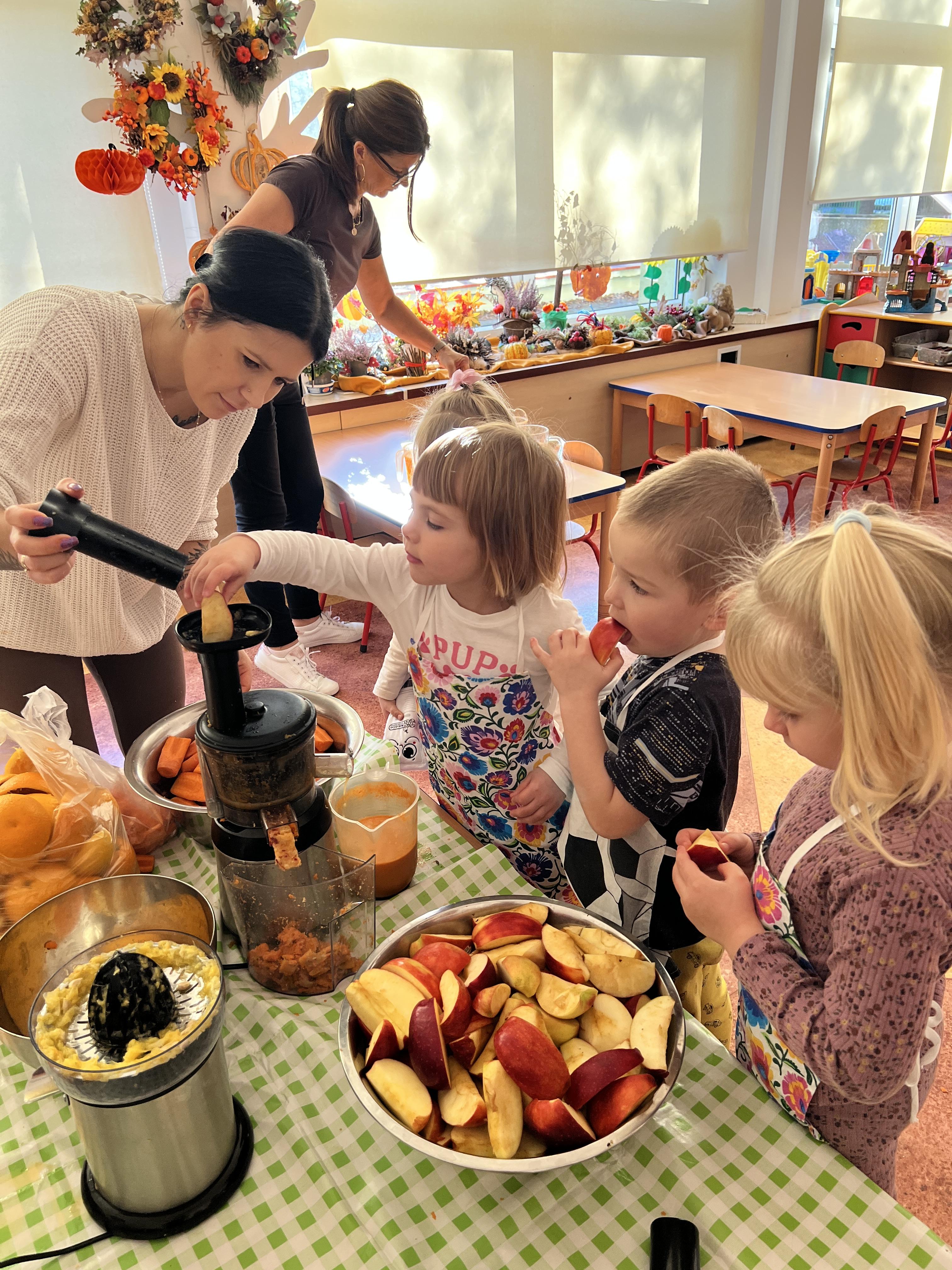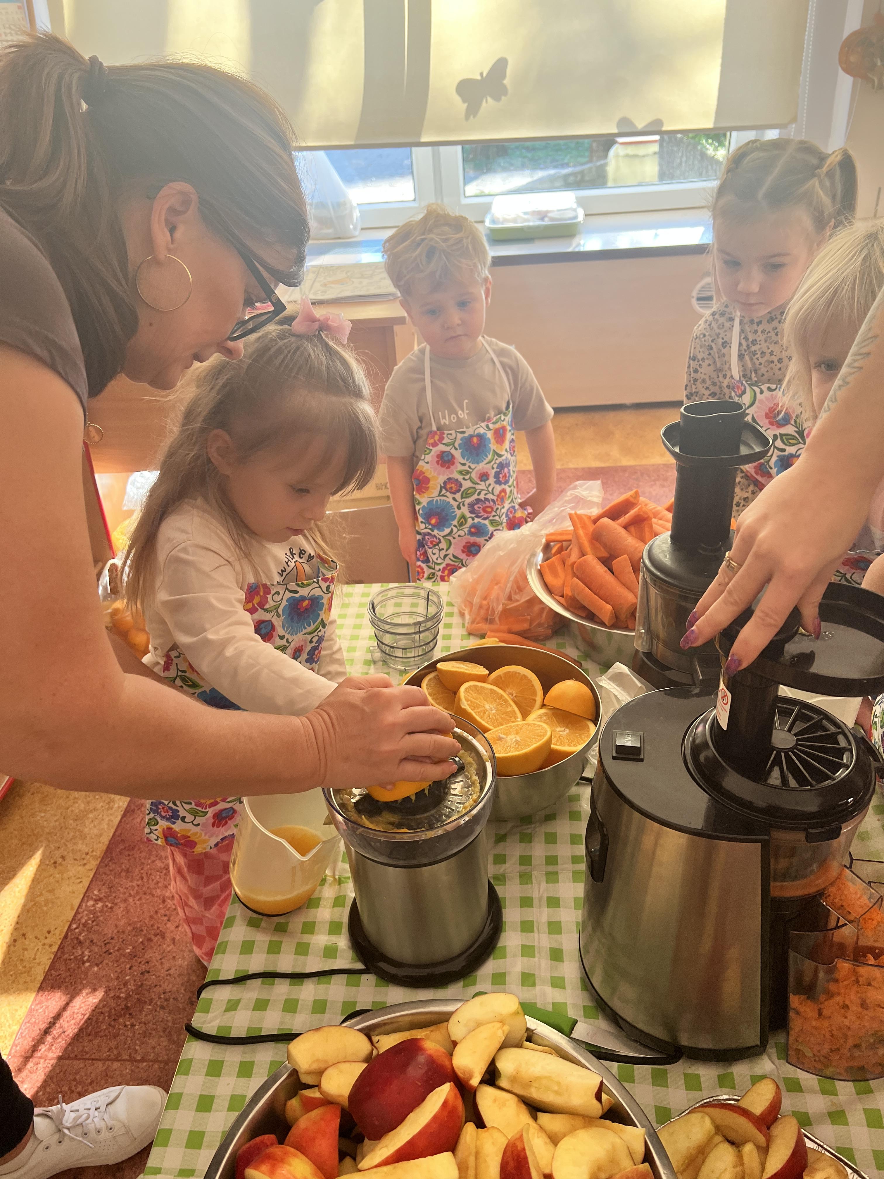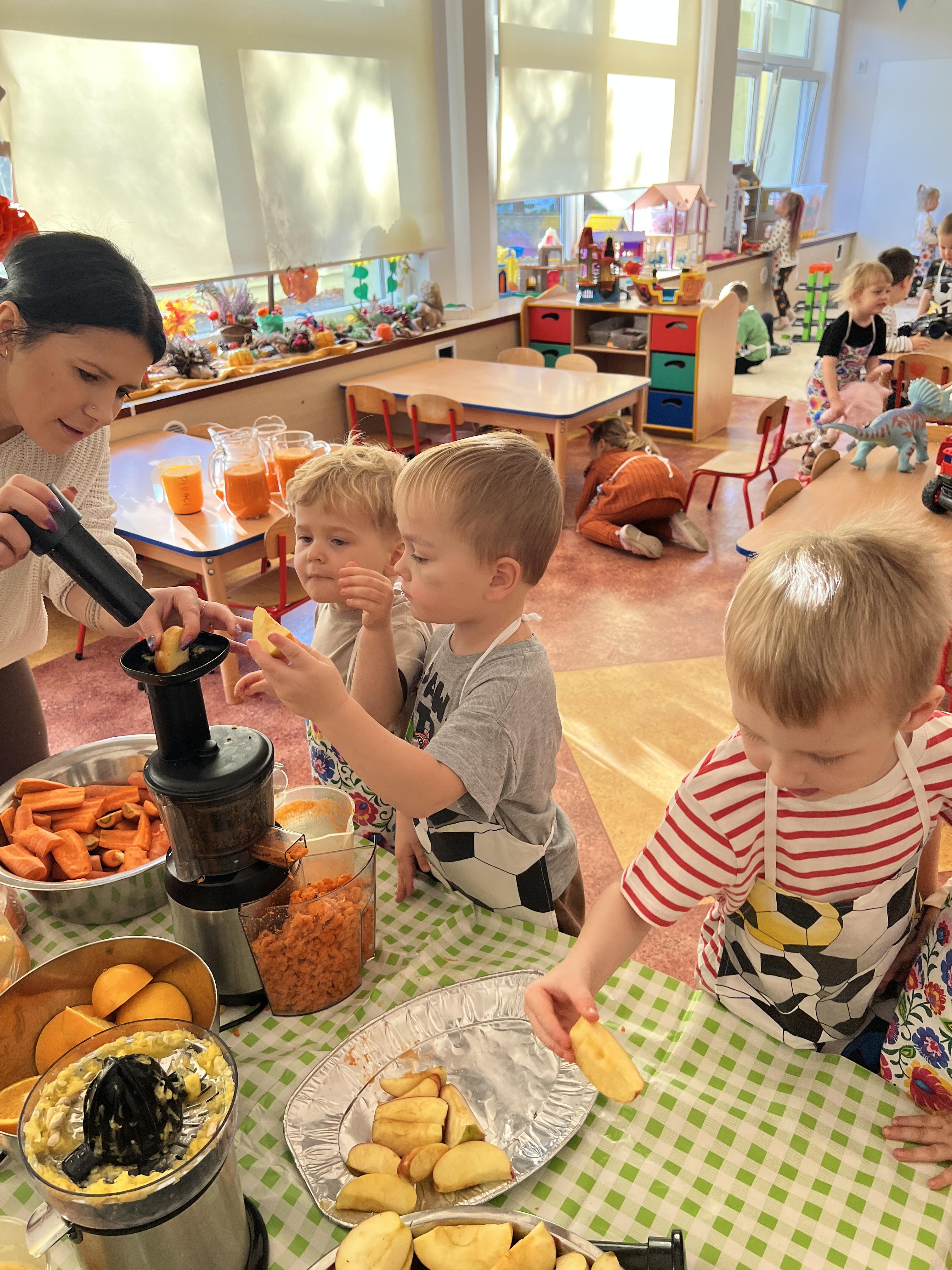 Z myślą o pysznych witaminkach, postanowiliśy sprawdzić jak wyczarować pyszny sok z owoców bez dodatku cukru i konserwantów. Jednak zanim przystąpiliśmy do pracy, przedszkolaki zapoznały się z urządzeniem do robienia soku – sokowirówką, jego działaniem oraz utrwaliły podstawowe zasady higieny i bezpieczeństwa. Następnie dzieci samodzielnie wyciskały sok. Po skończonej pracy delektowały się jego smakiem. Bardzo dziękujemy mamie Mai za wspólnie spędzony czas. Zachęcamy i zapraszamy wszystkich rodziców do odwiedzin