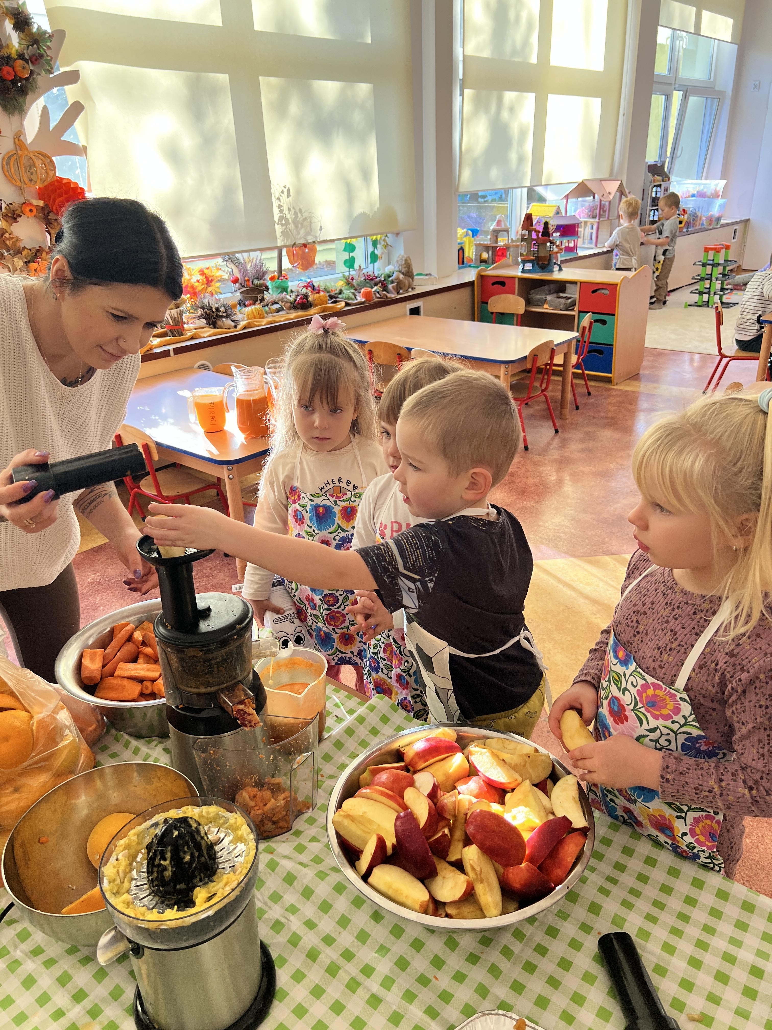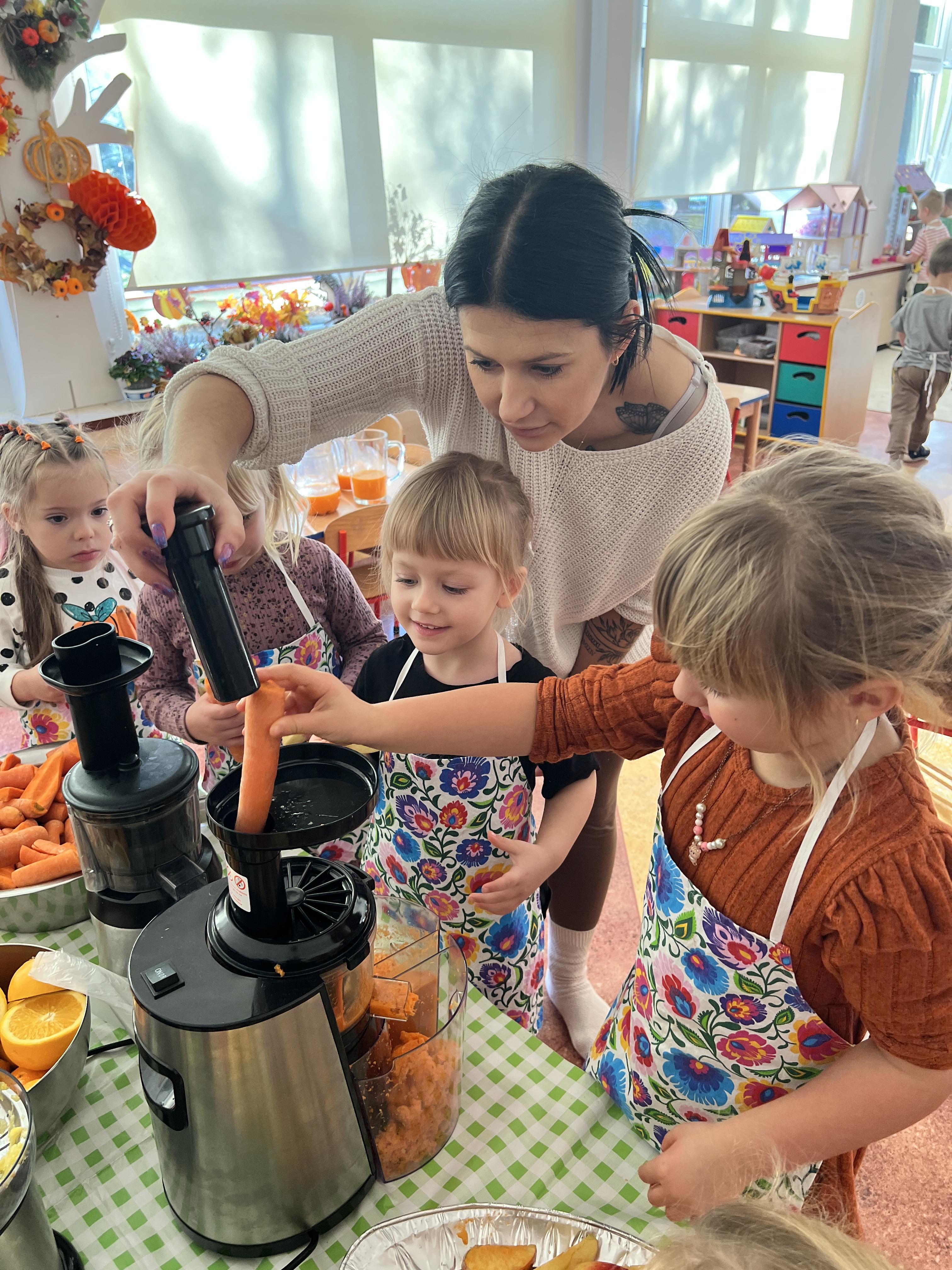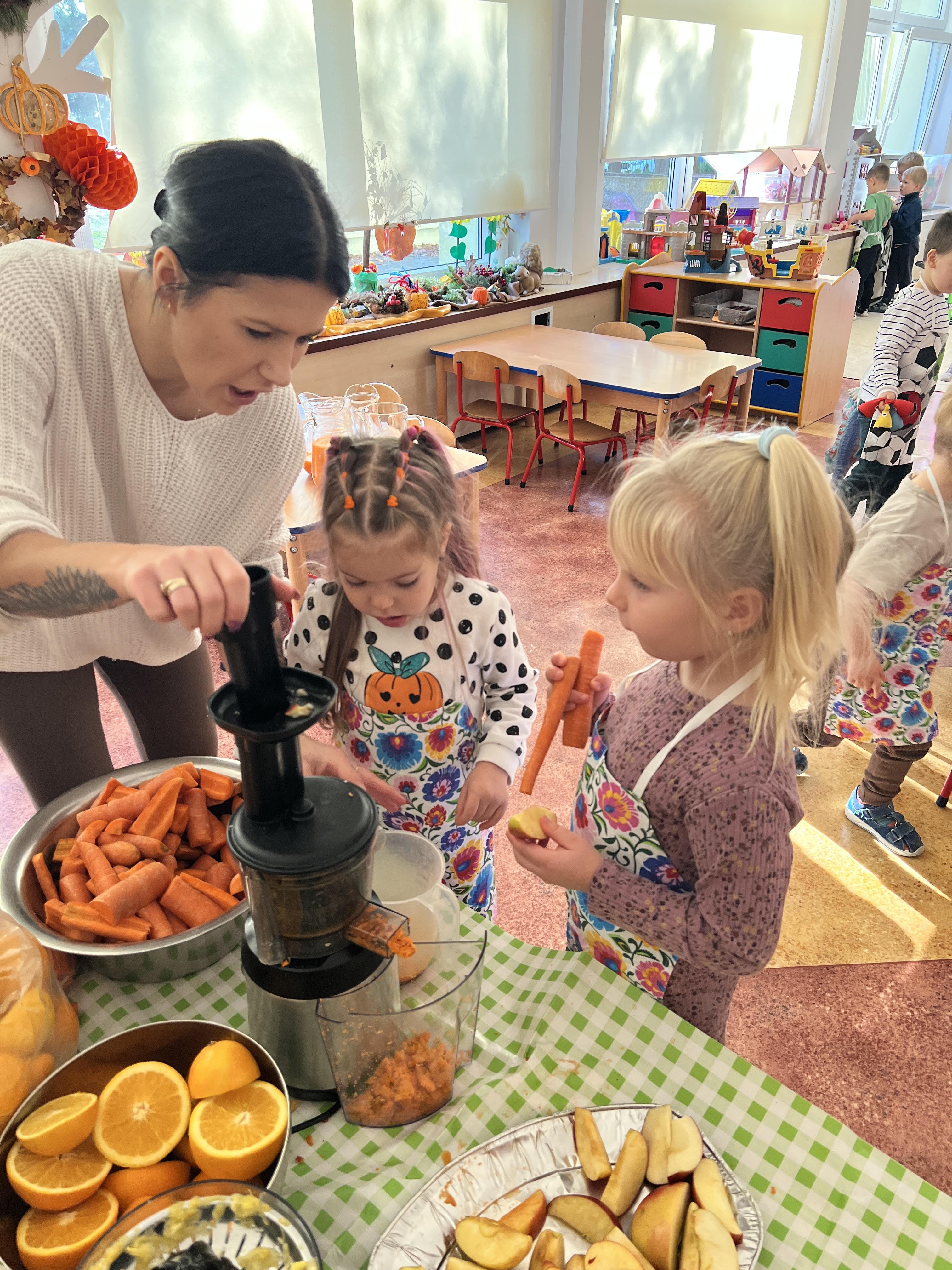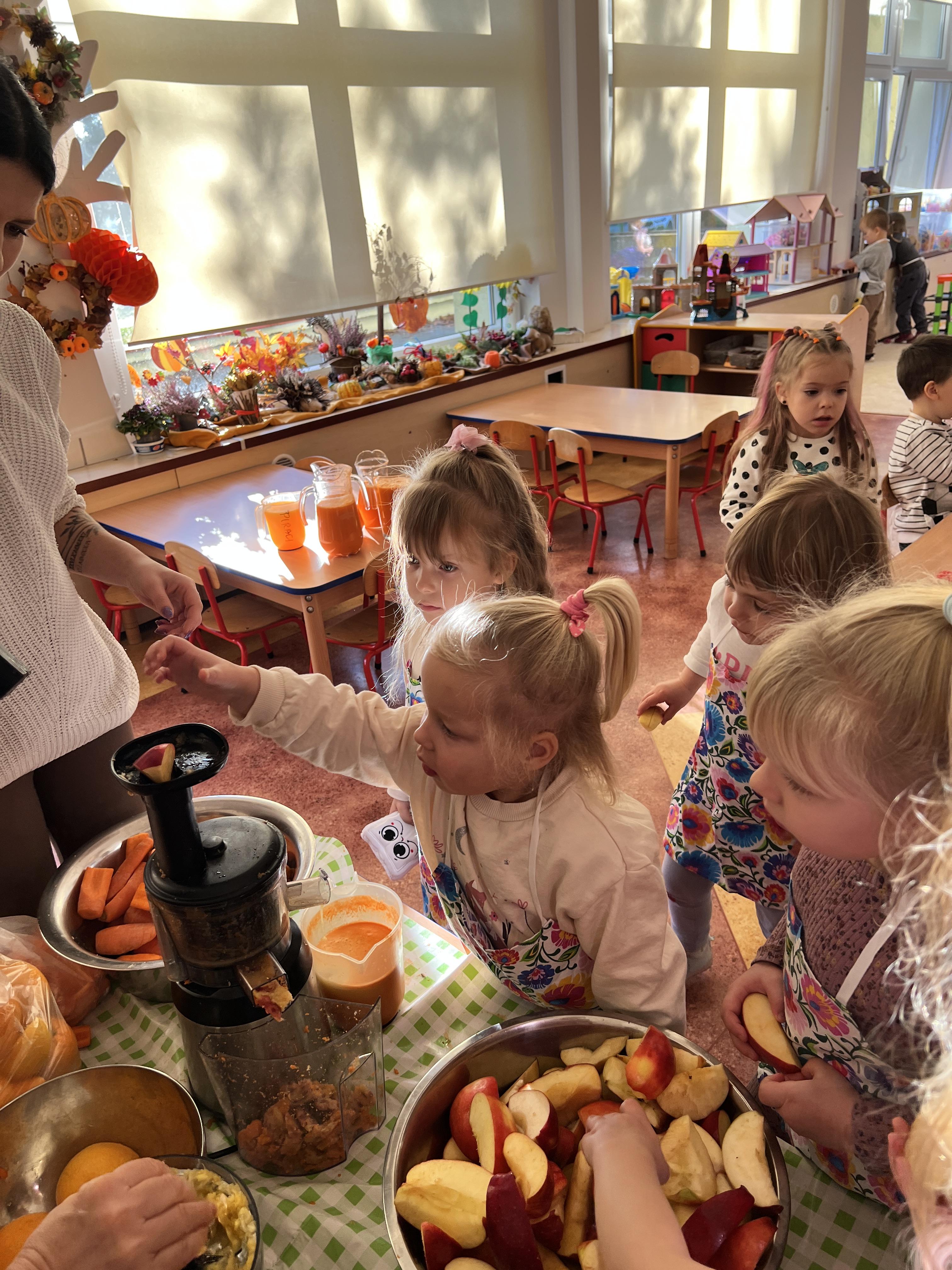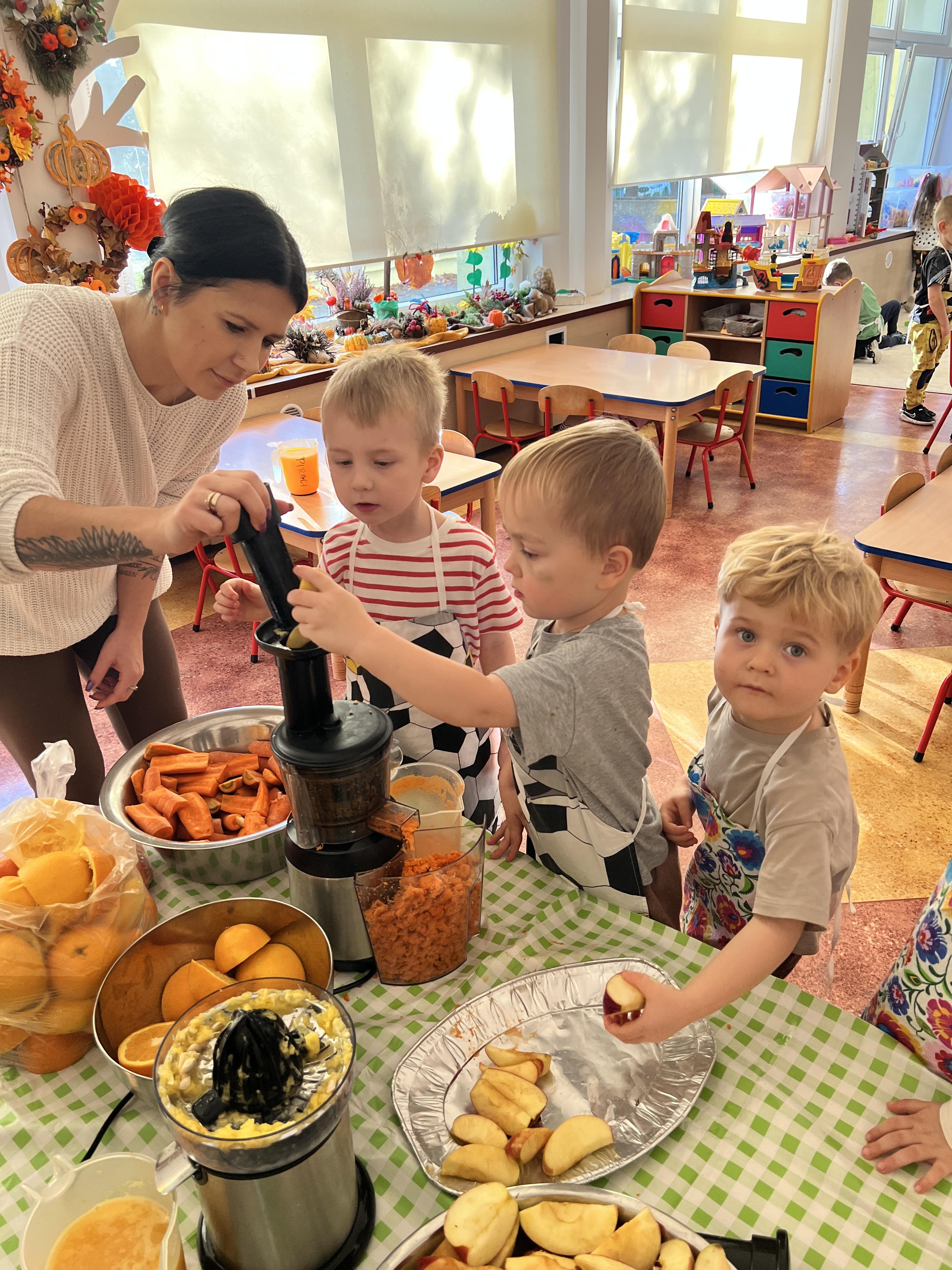 Z myślą o pysznych witaminkach, postanowiliśy sprawdzić jak wyczarować pyszny sok z owoców bez dodatku cukru i konserwantów. Jednak zanim przystąpiliśmy do pracy, przedszkolaki zapoznały się z urządzeniem do robienia soku – sokowirówką, jego działaniem oraz utrwaliły podstawowe zasady higieny i bezpieczeństwa. Następnie dzieci samodzielnie wyciskały sok. Po skończonej pracy delektowały się jego smakiem. Bardzo dziękujemy mamie Mai za wspólnie spędzony czas. Zachęcamy i zapraszamy wszystkich rodziców do odwiedzin