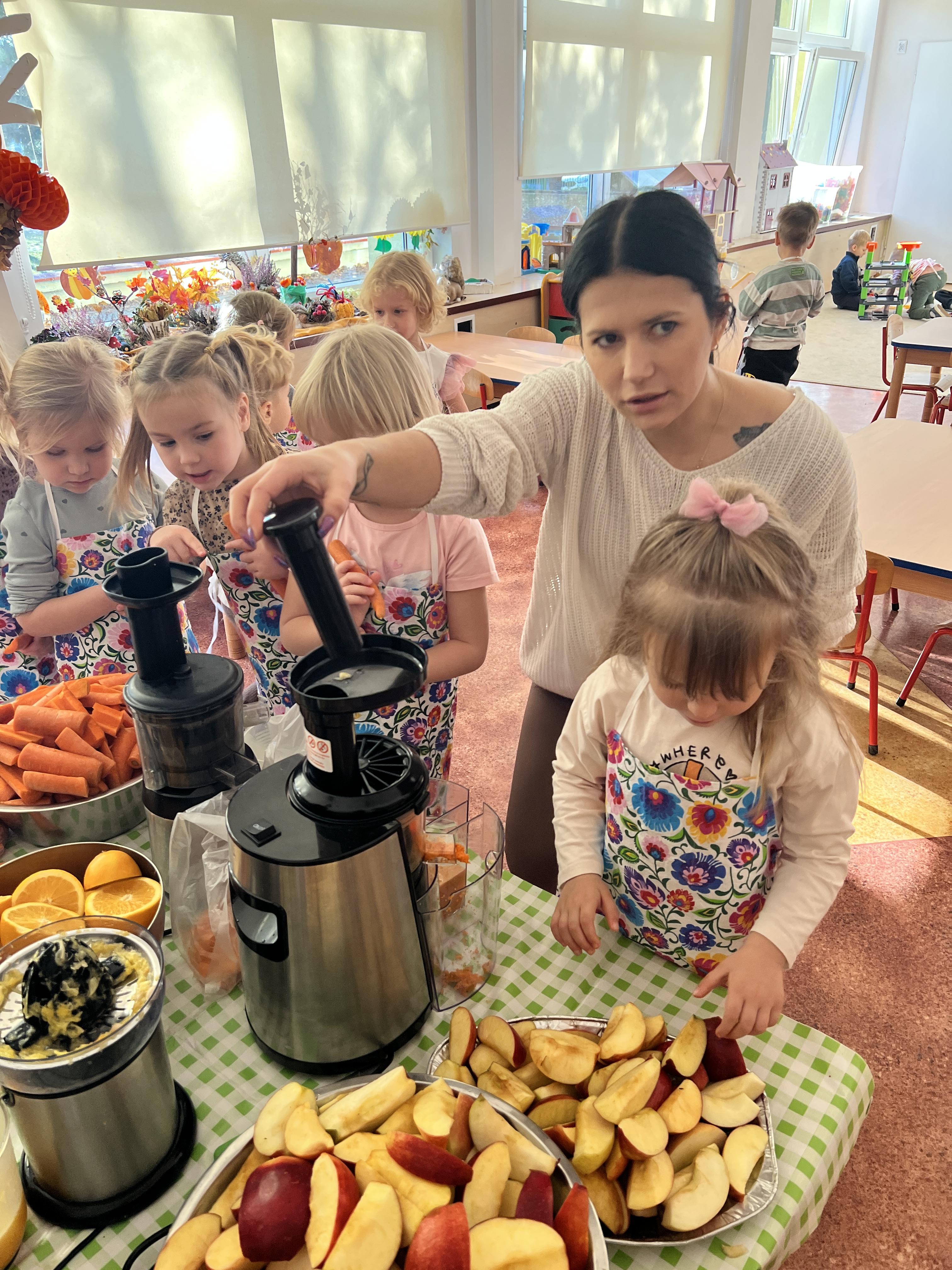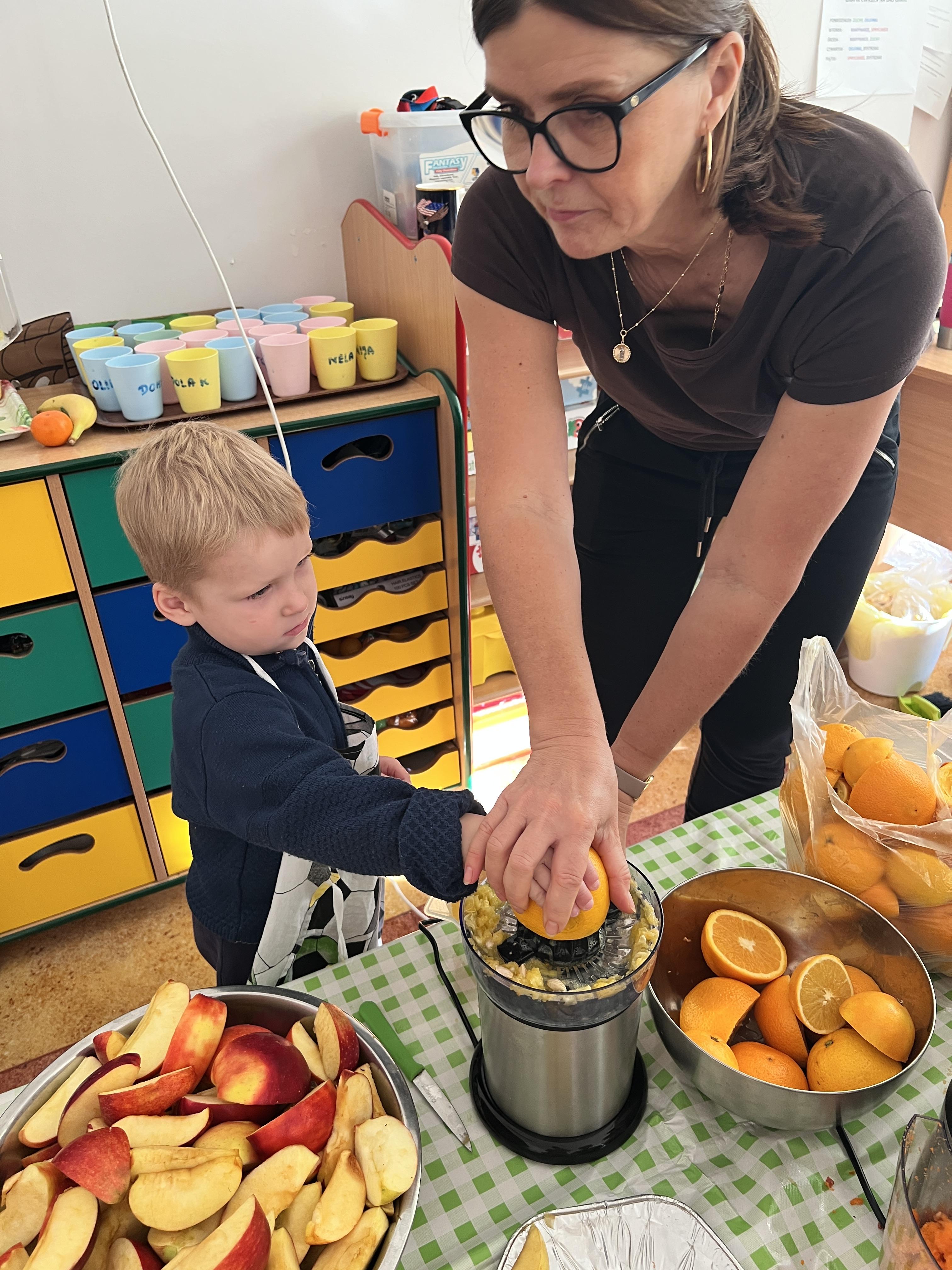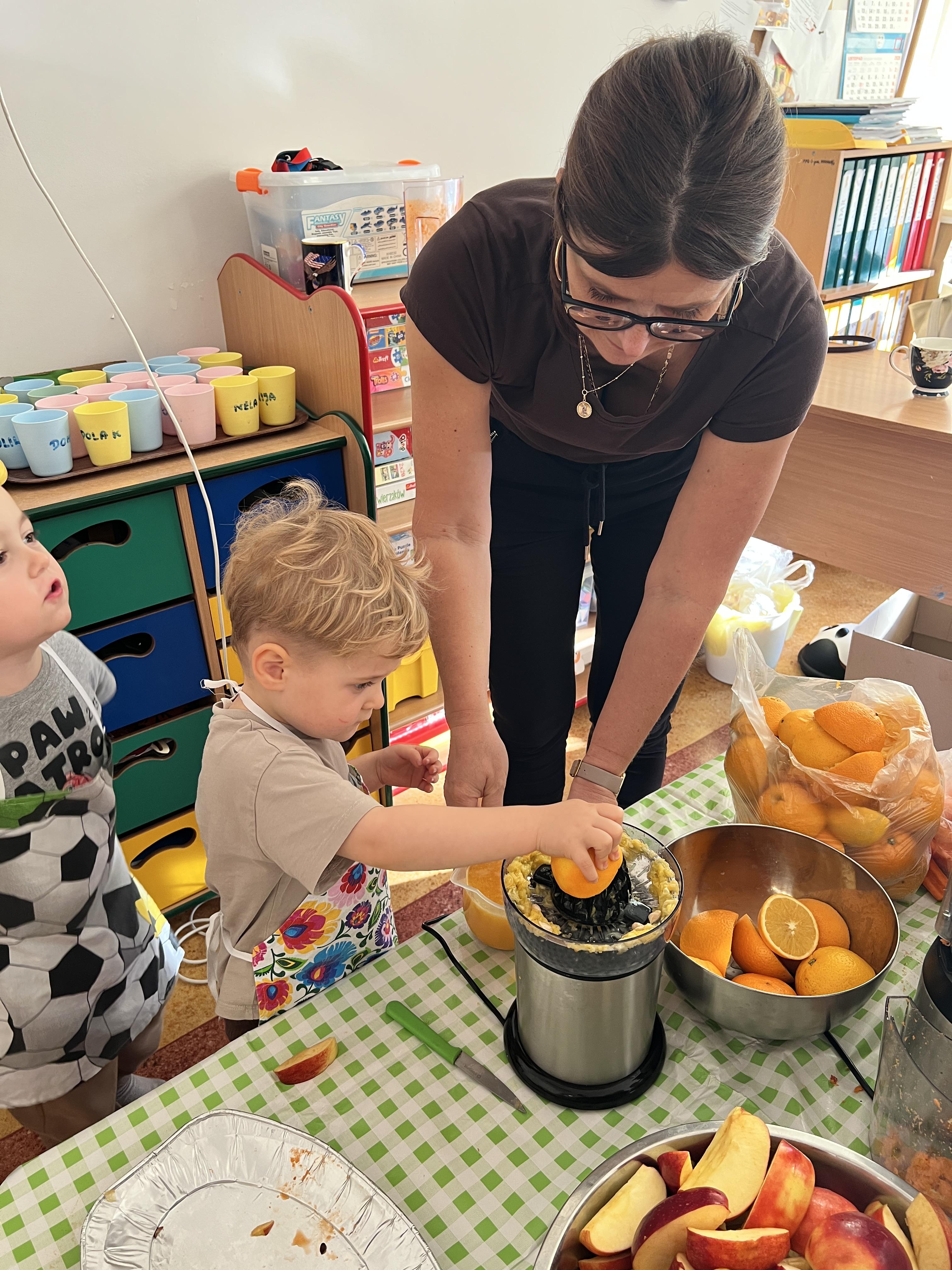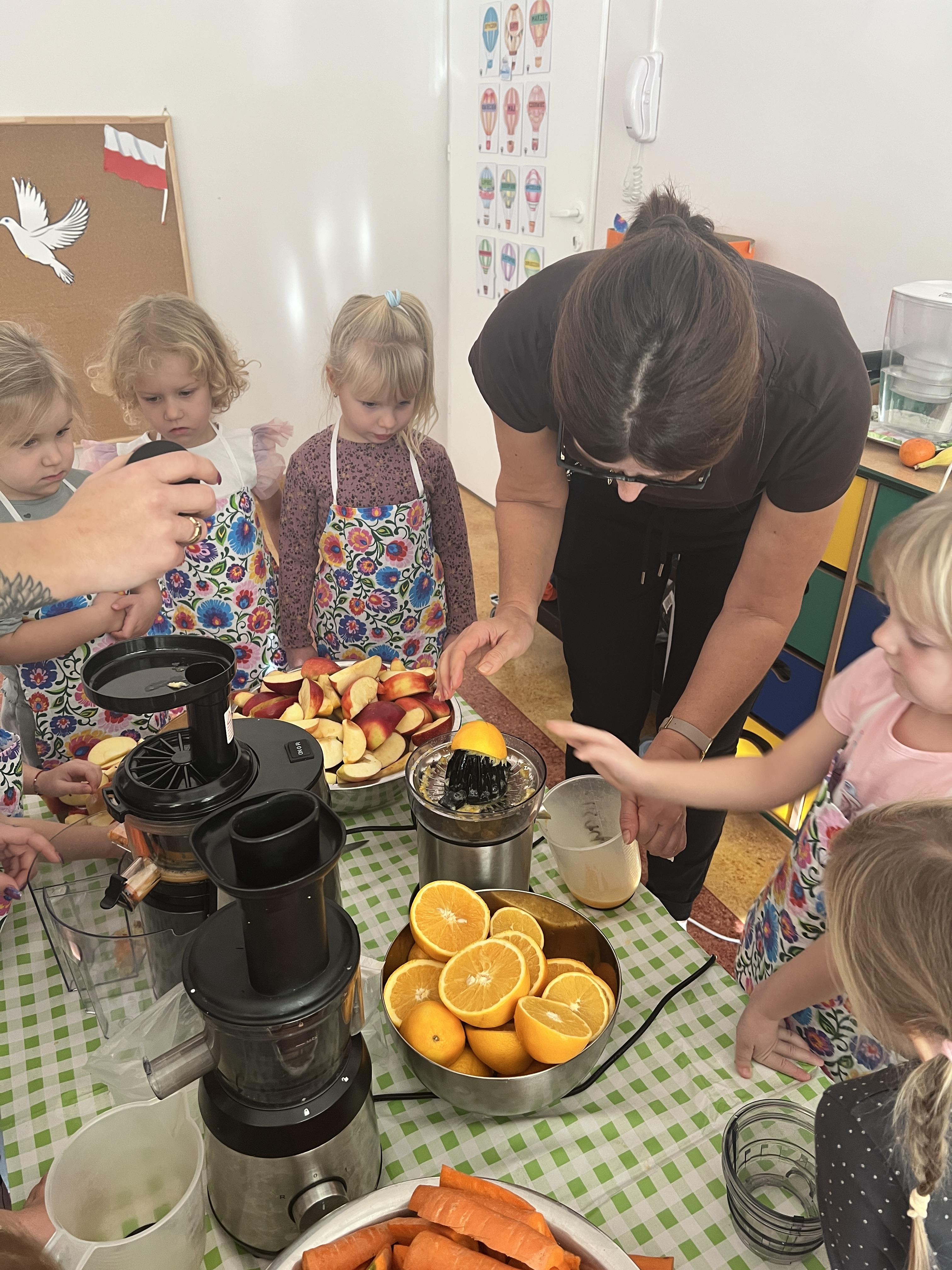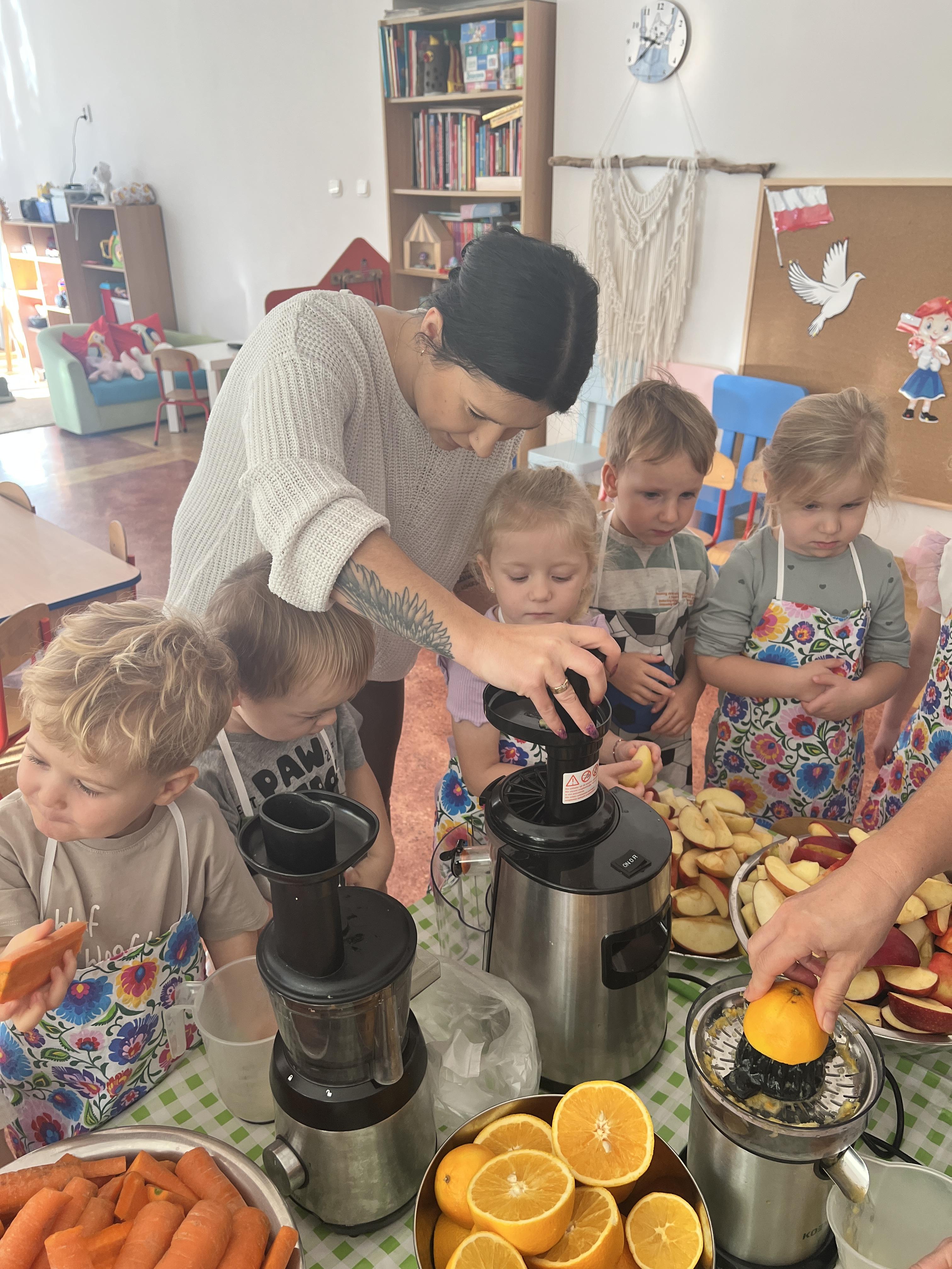 Z myślą o pysznych witaminkach, postanowiliśy sprawdzić jak wyczarować pyszny sok z owoców bez dodatku cukru i konserwantów. Jednak zanim przystąpiliśmy do pracy, przedszkolaki zapoznały się z urządzeniem do robienia soku – sokowirówką, jego działaniem oraz utrwaliły podstawowe zasady higieny i bezpieczeństwa. Następnie dzieci samodzielnie wyciskały sok. Po skończonej pracy delektowały się jego smakiem. Bardzo dziękujemy mamie Mai za wspólnie spędzony czas. Zachęcamy i zapraszamy wszystkich rodziców do odwiedzin