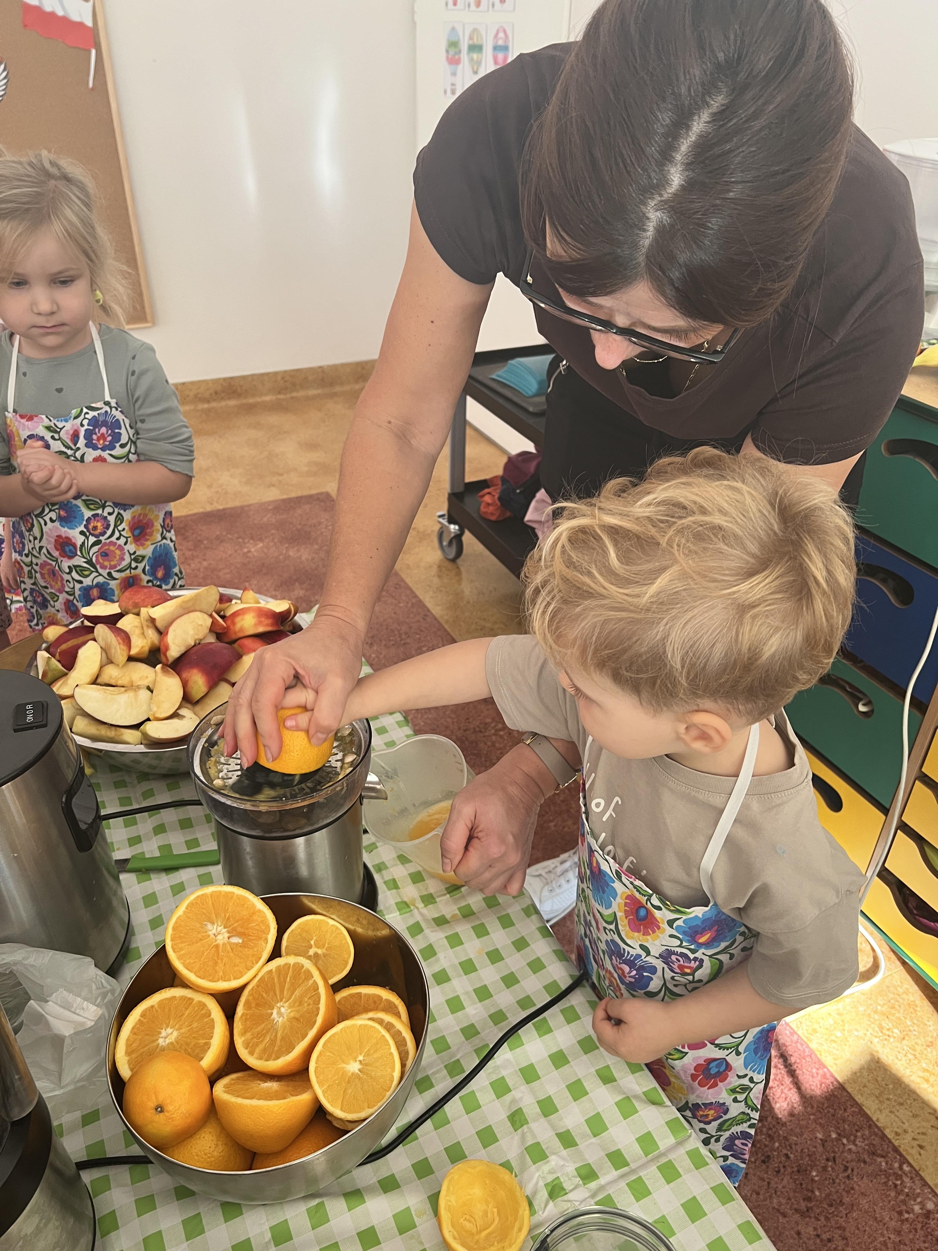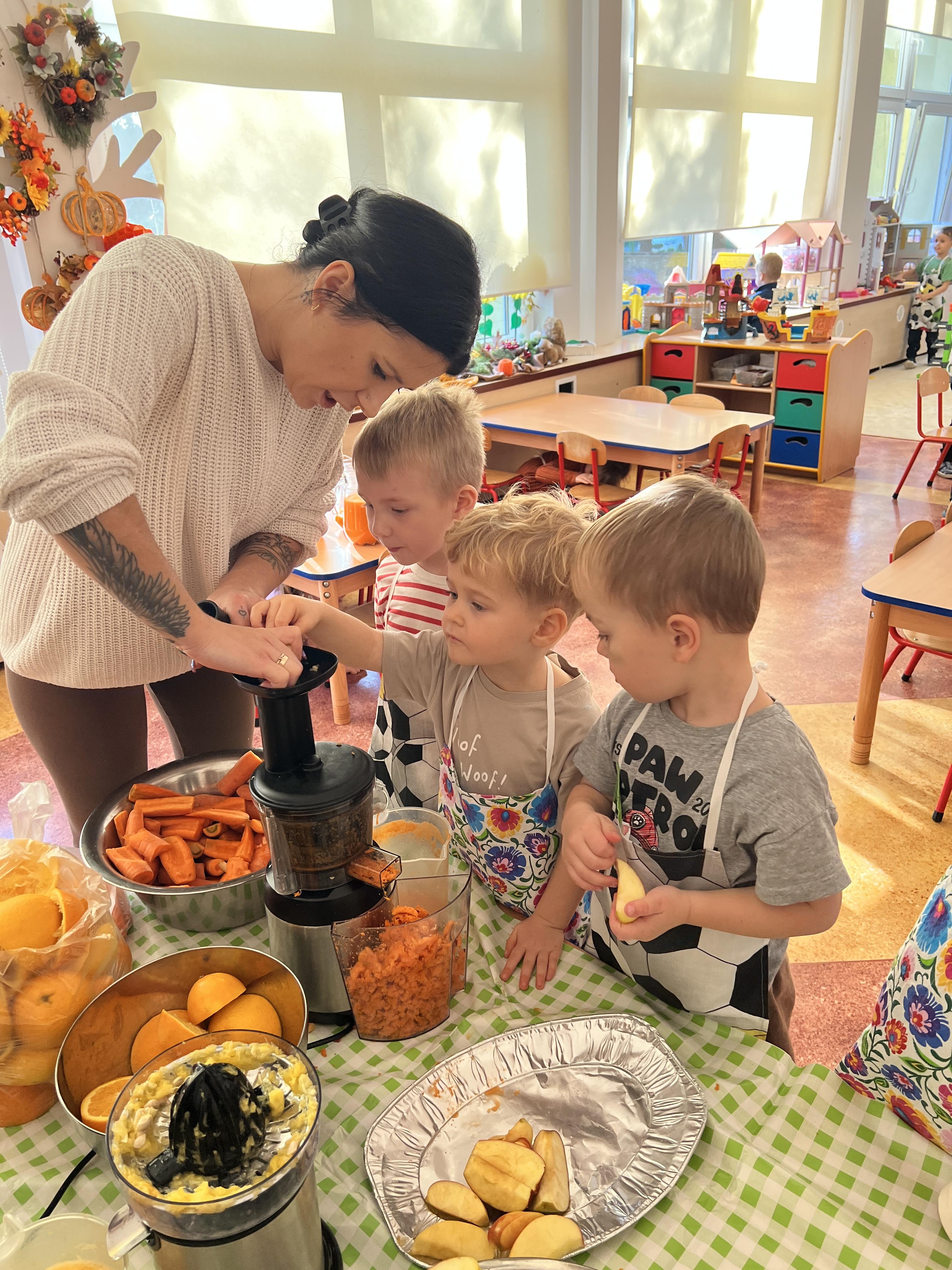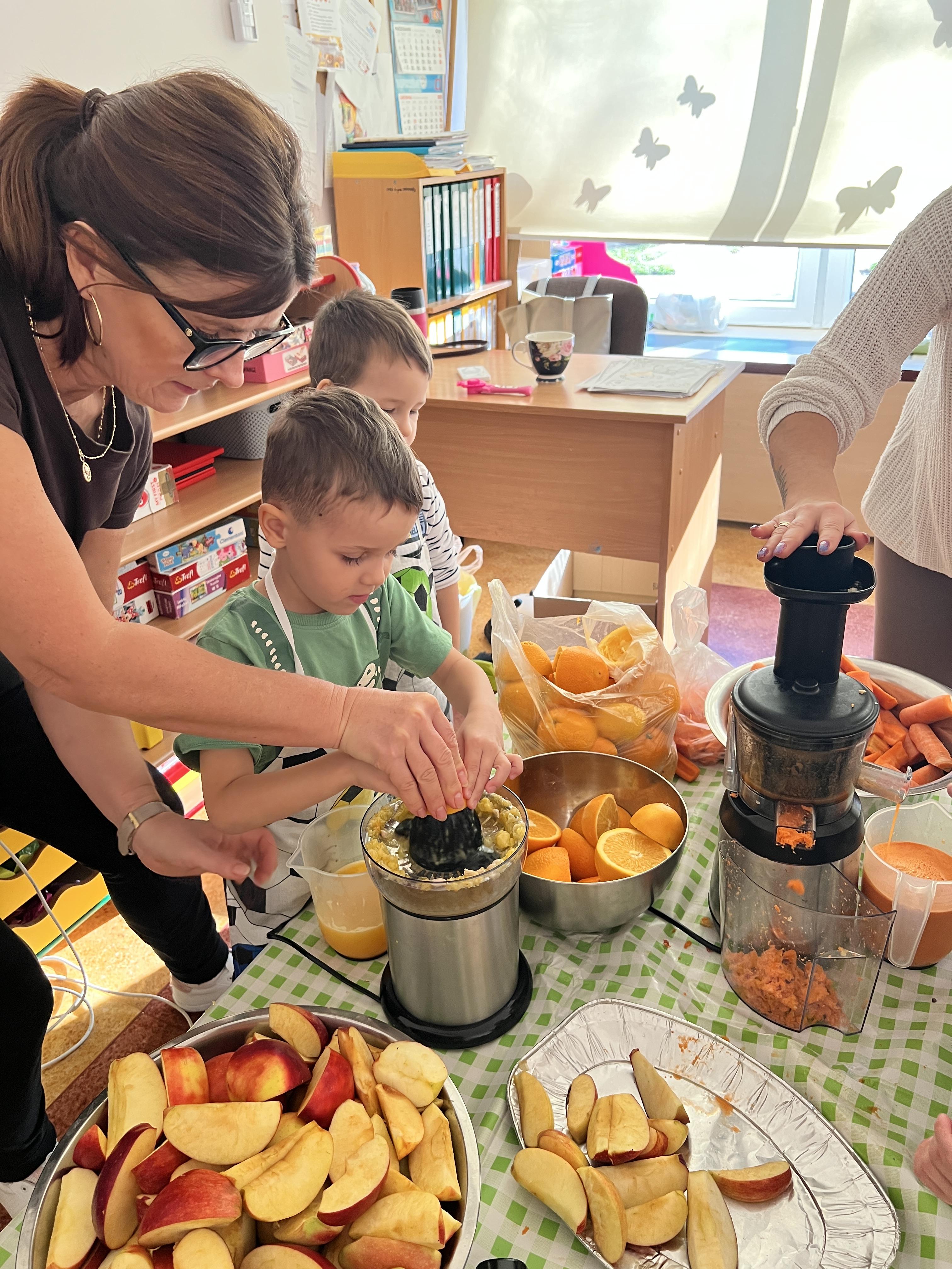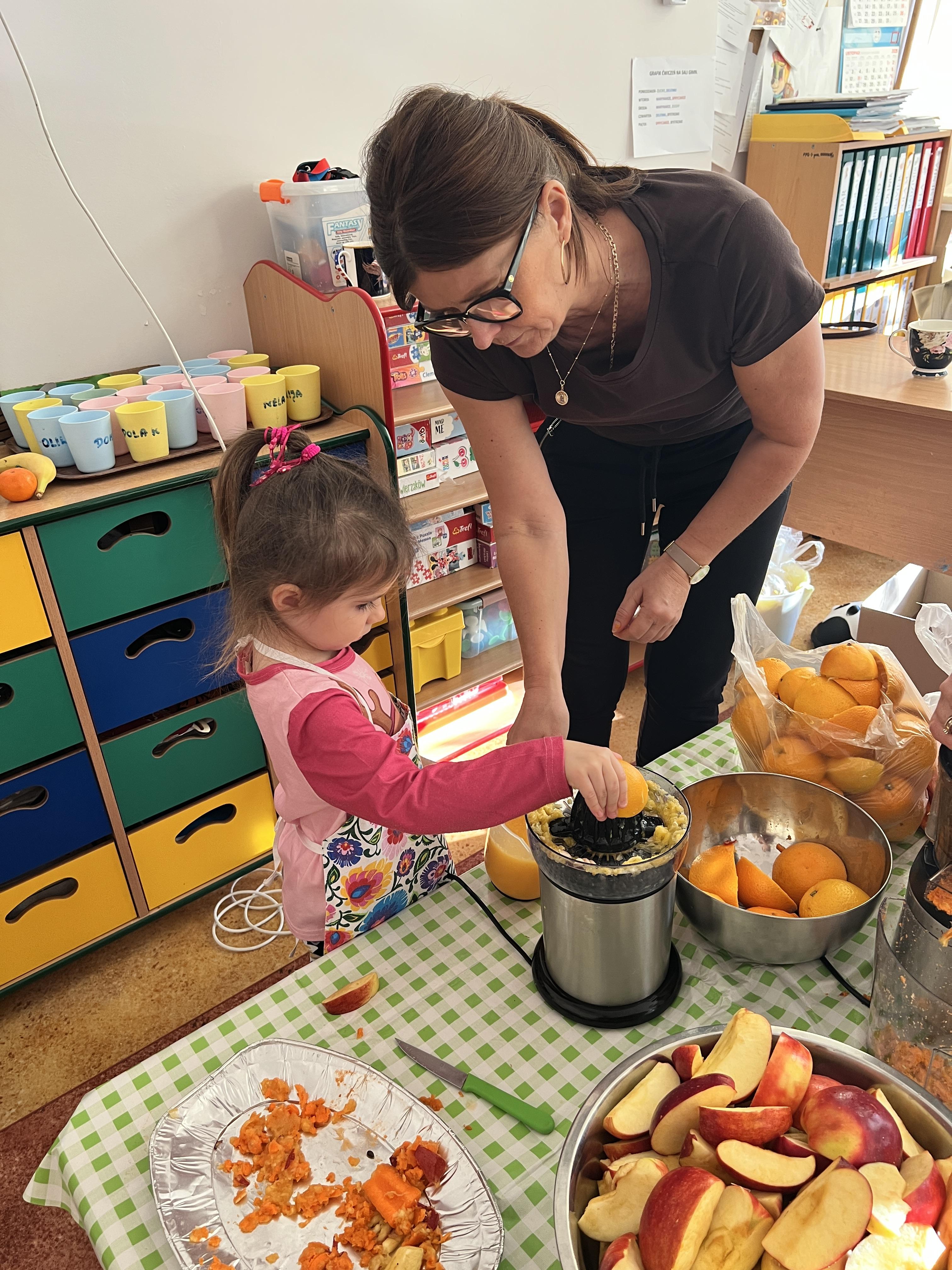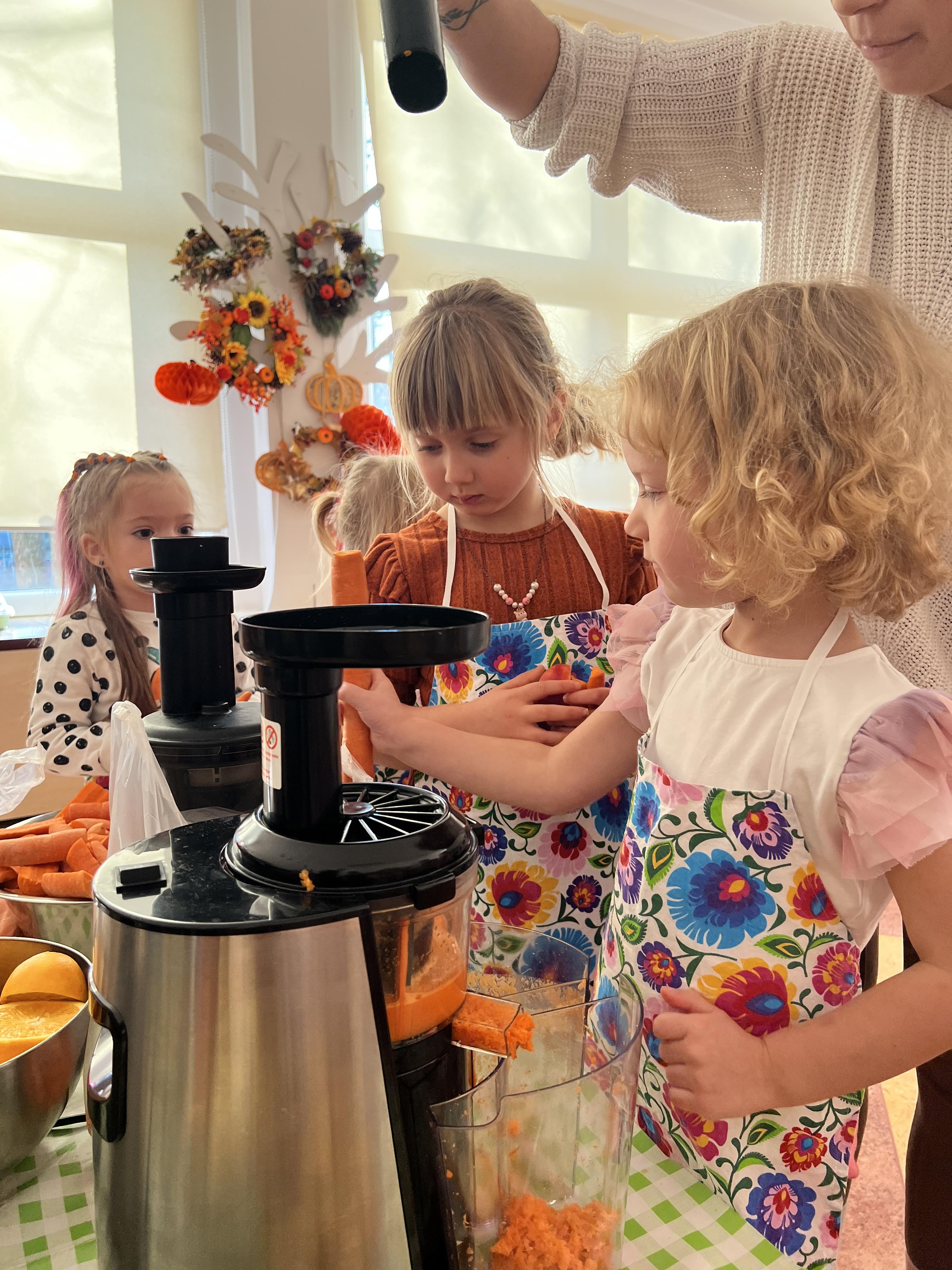 Z myślą o pysznych witaminkach, postanowiliśy sprawdzić jak wyczarować pyszny sok z owoców bez dodatku cukru i konserwantów. Jednak zanim przystąpiliśmy do pracy, przedszkolaki zapoznały się z urządzeniem do robienia soku – sokowirówką, jego działaniem oraz utrwaliły podstawowe zasady higieny i bezpieczeństwa. Następnie dzieci samodzielnie wyciskały sok. Po skończonej pracy delektowały się jego smakiem. Bardzo dziękujemy mamie Mai za wspólnie spędzony czas. Zachęcamy i zapraszamy wszystkich rodziców do odwiedzin