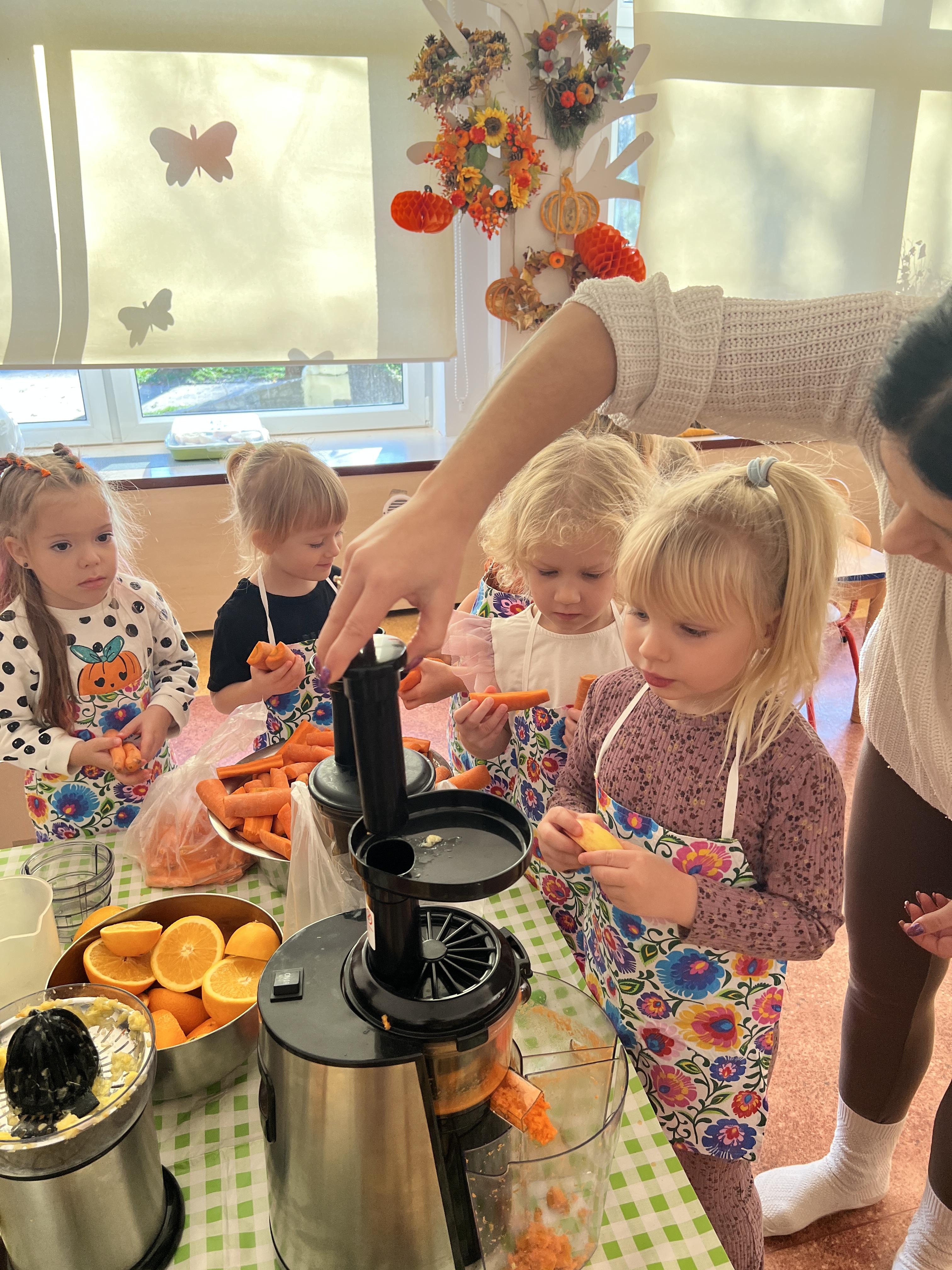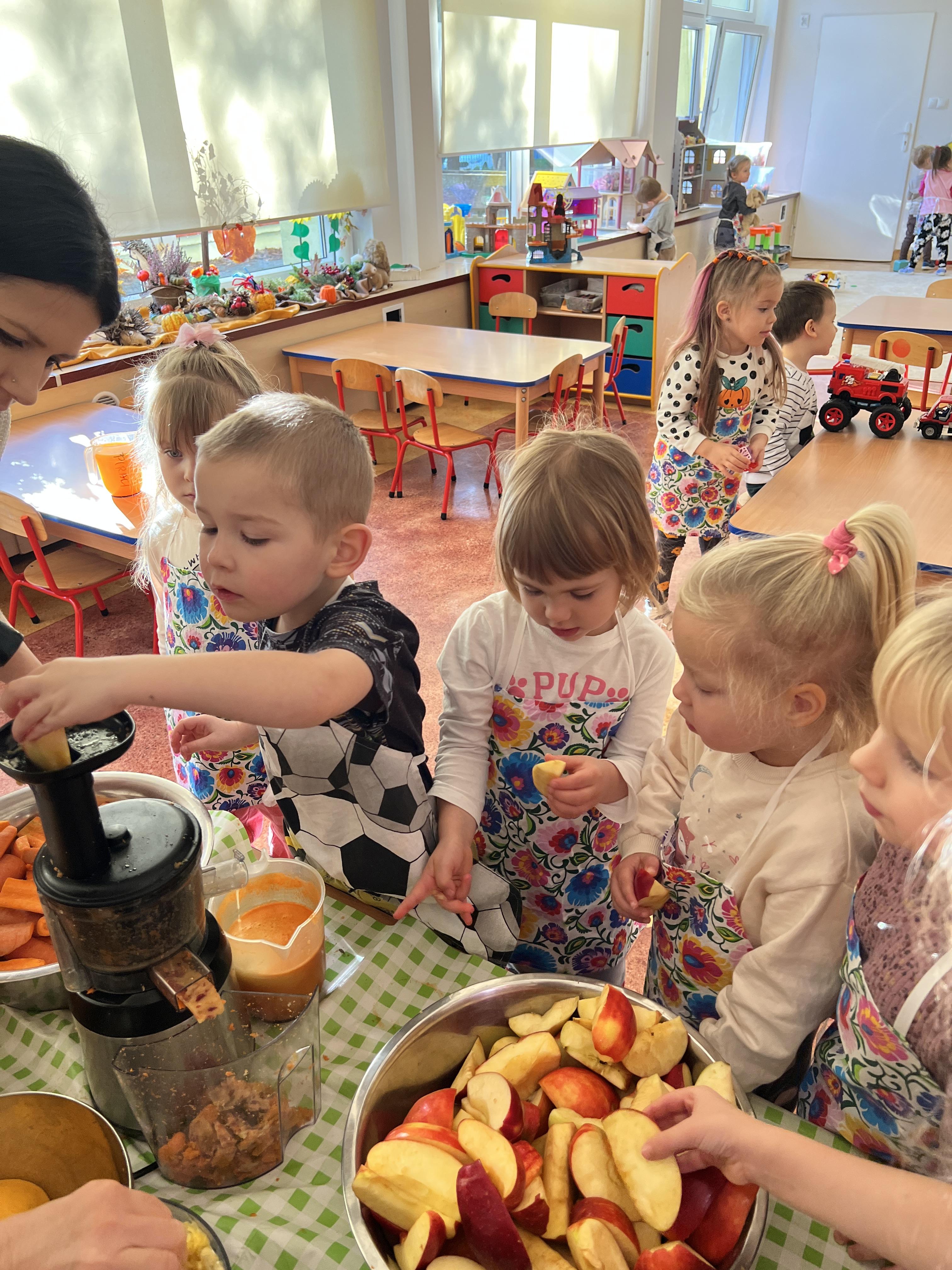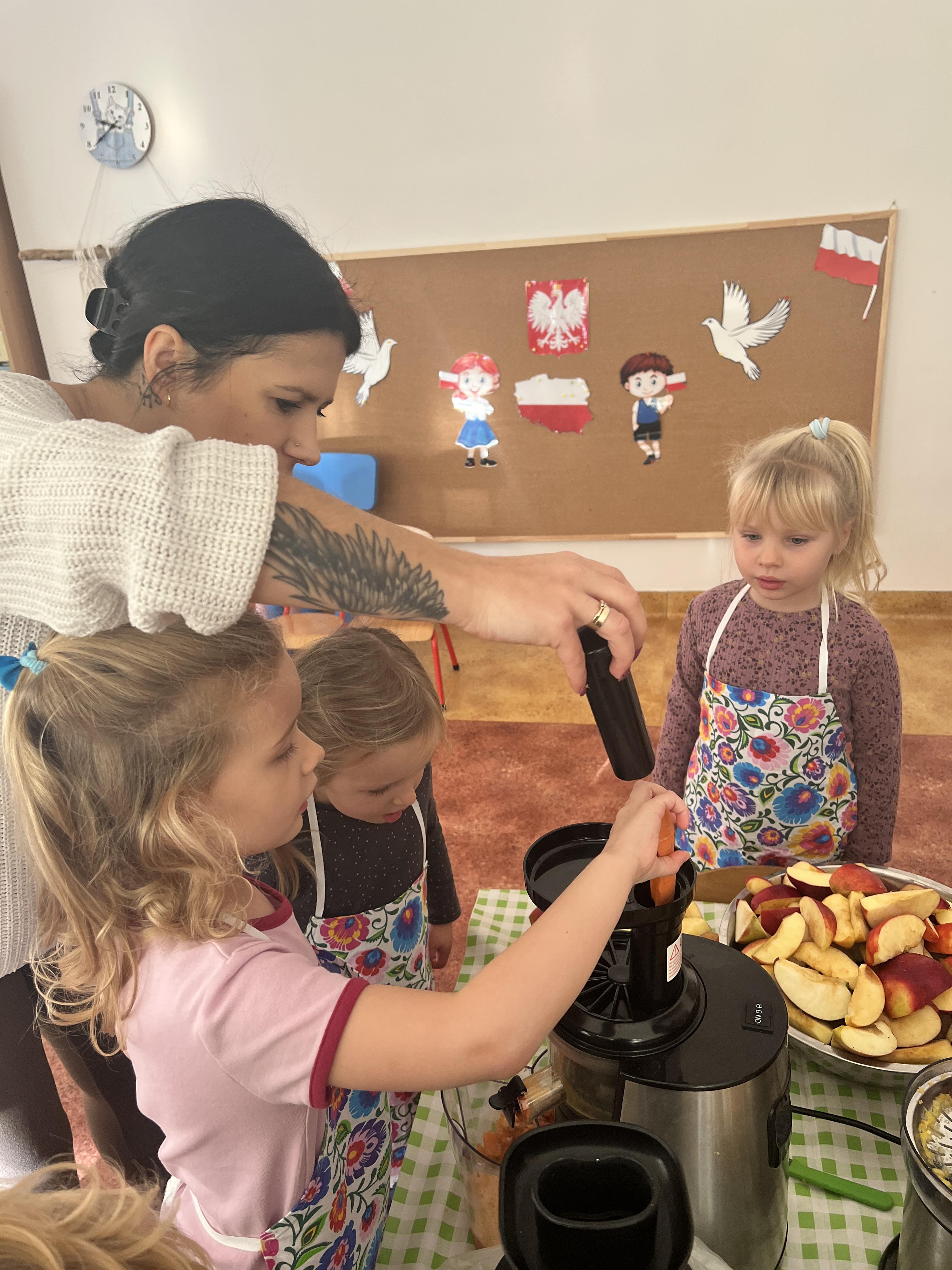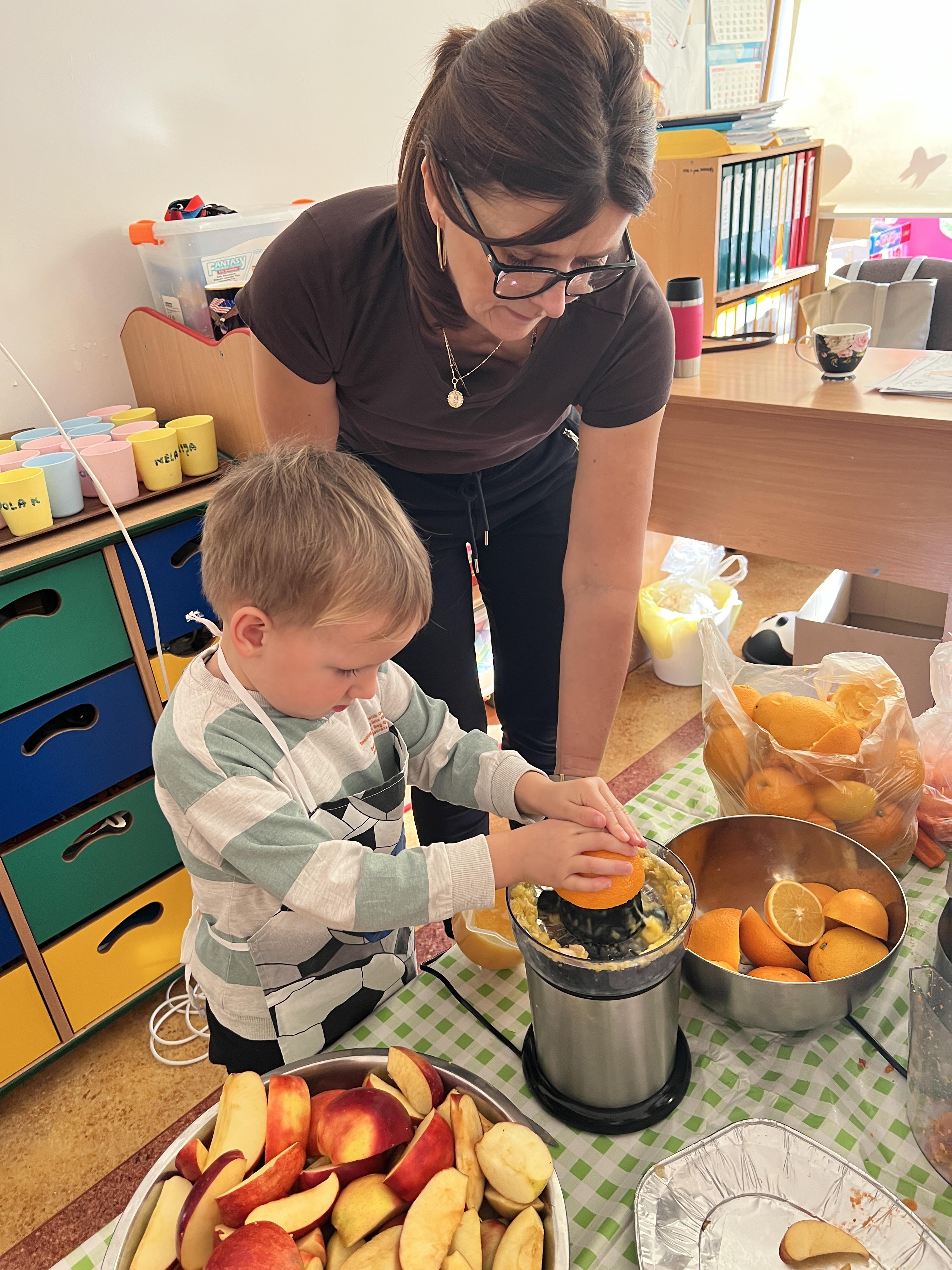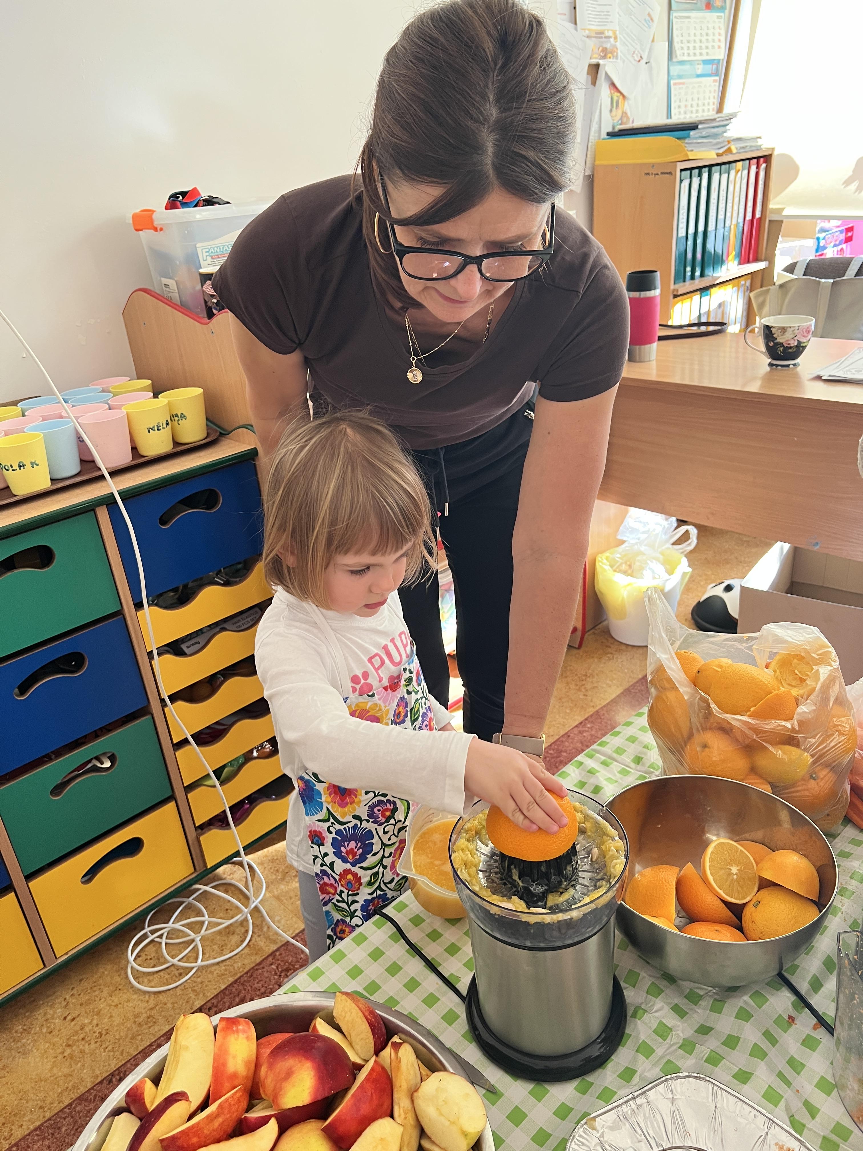 Z myślą o pysznych witaminkach, postanowiliśy sprawdzić jak wyczarować pyszny sok z owoców bez dodatku cukru i konserwantów. Jednak zanim przystąpiliśmy do pracy, przedszkolaki zapoznały się z urządzeniem do robienia soku – sokowirówką, jego działaniem oraz utrwaliły podstawowe zasady higieny i bezpieczeństwa. Następnie dzieci samodzielnie wyciskały sok. Po skończonej pracy delektowały się jego smakiem. Bardzo dziękujemy mamie Mai za wspólnie spędzony czas. Zachęcamy i zapraszamy wszystkich rodziców do odwiedzin