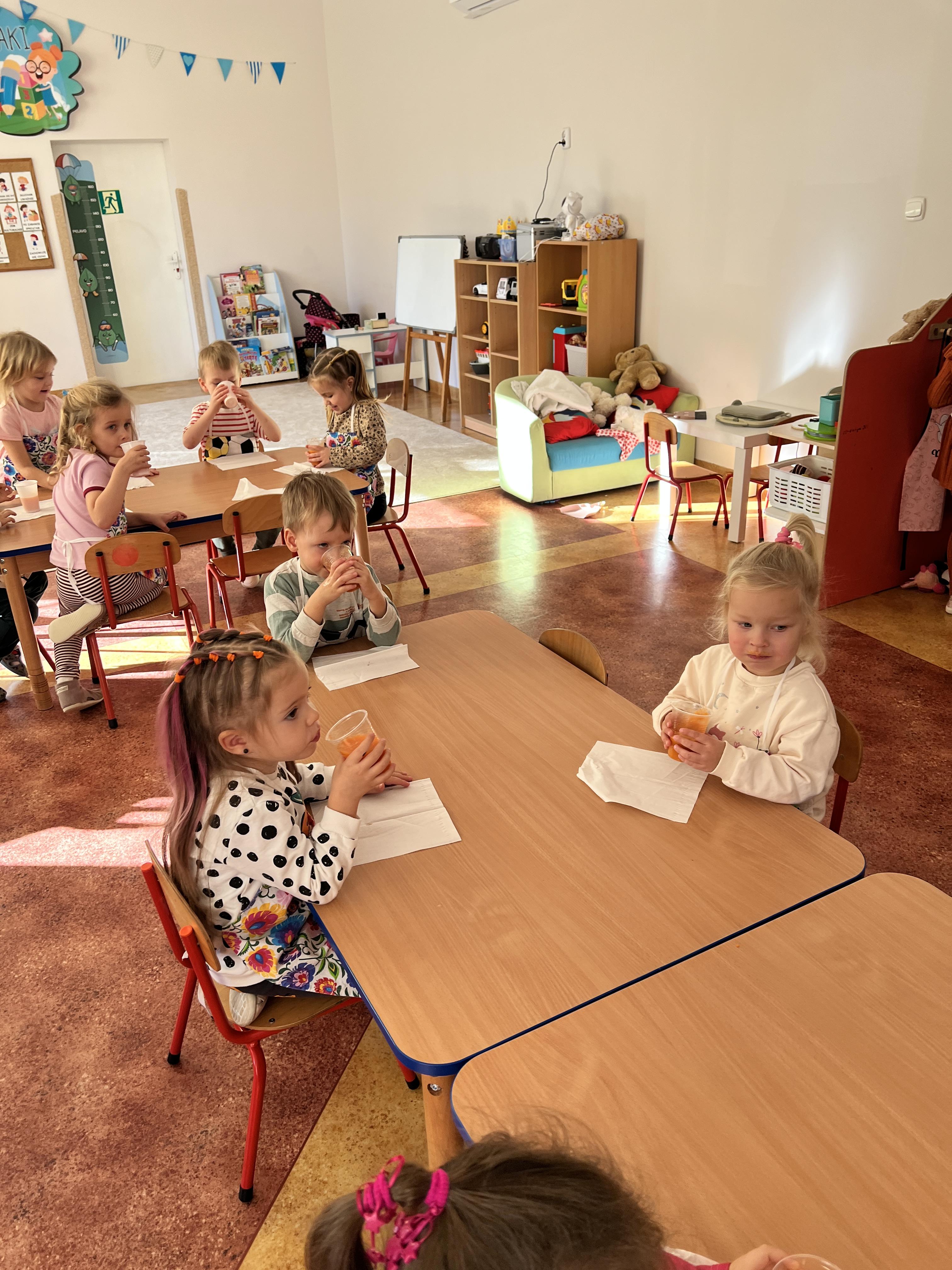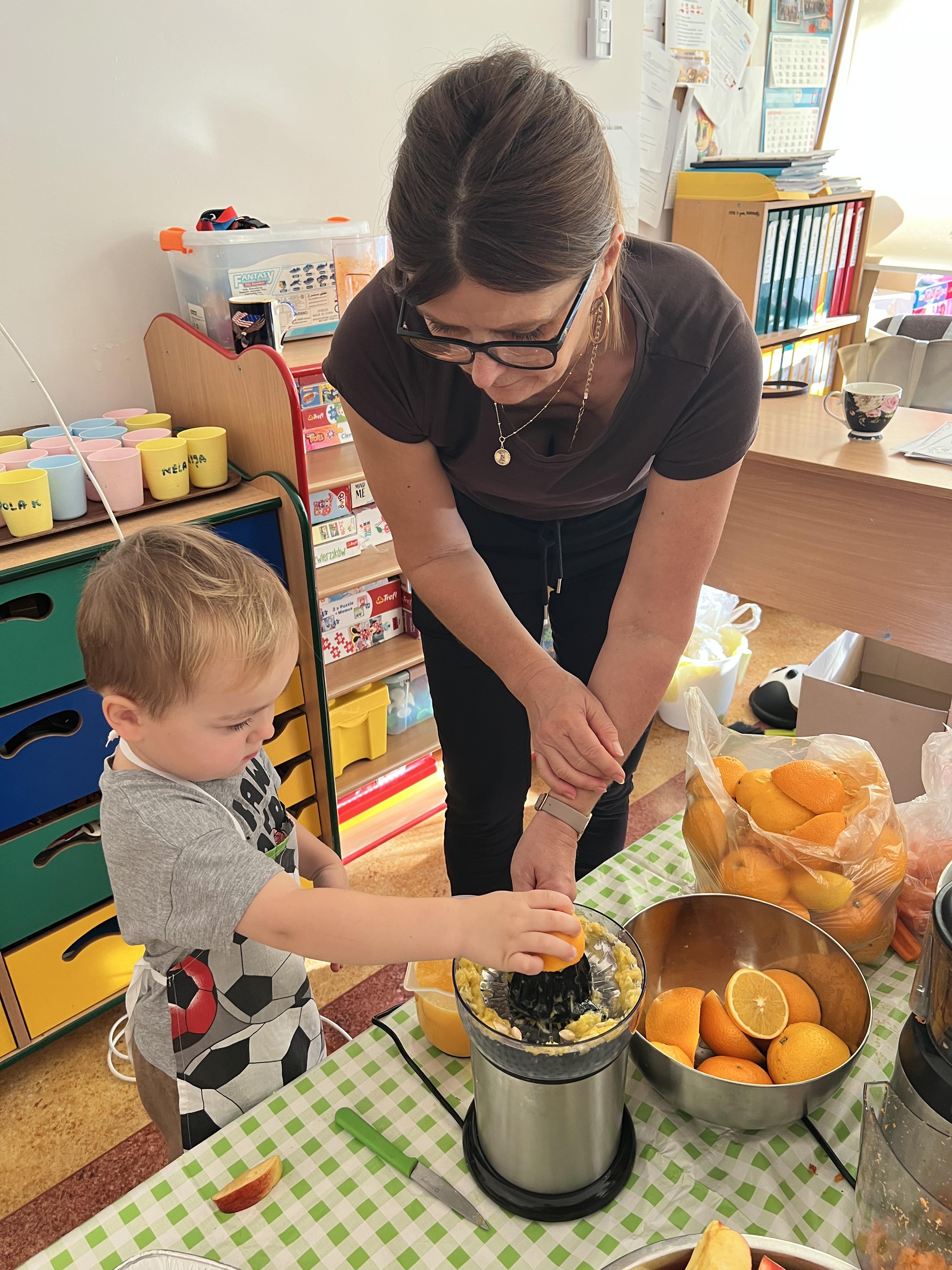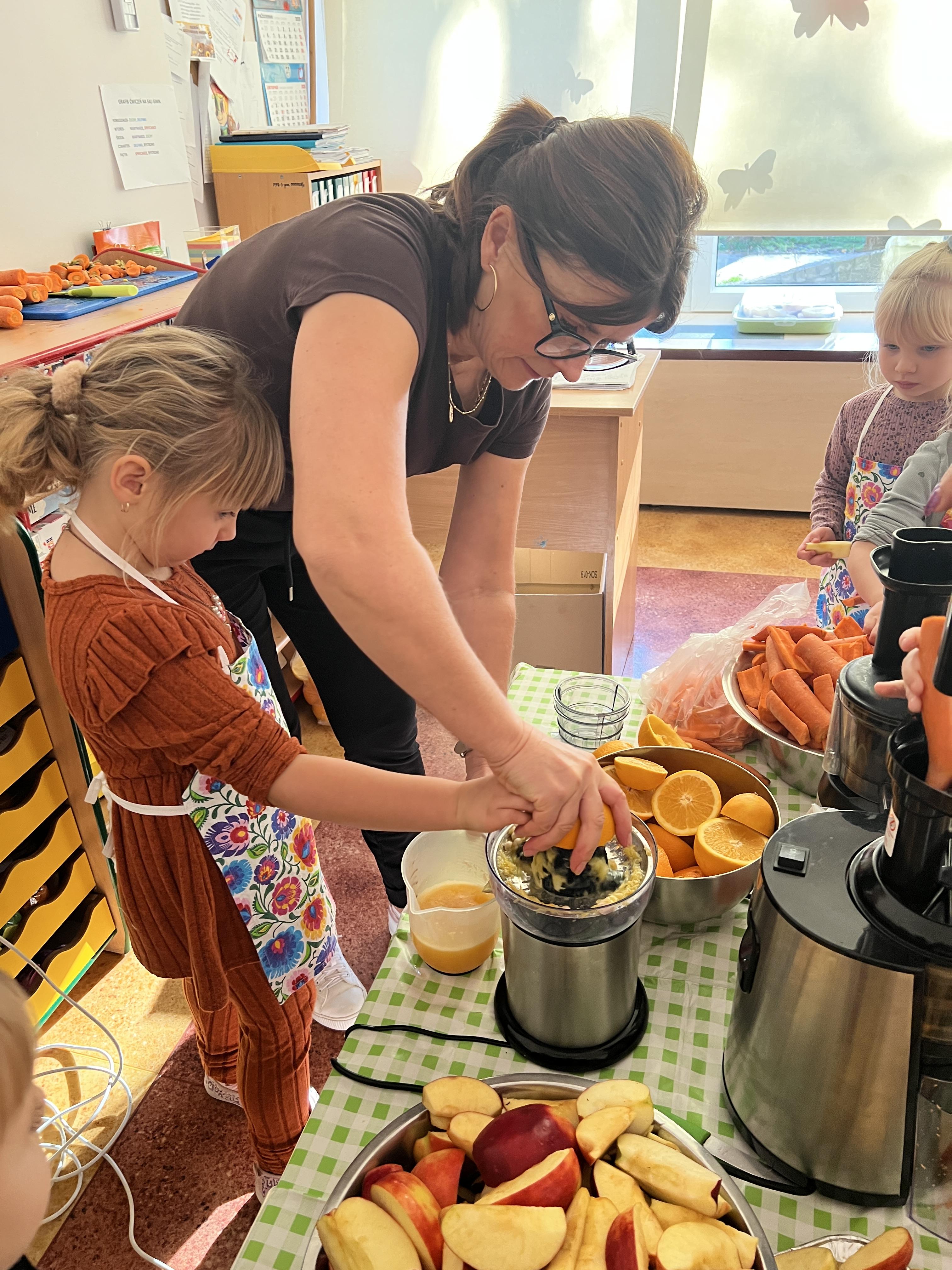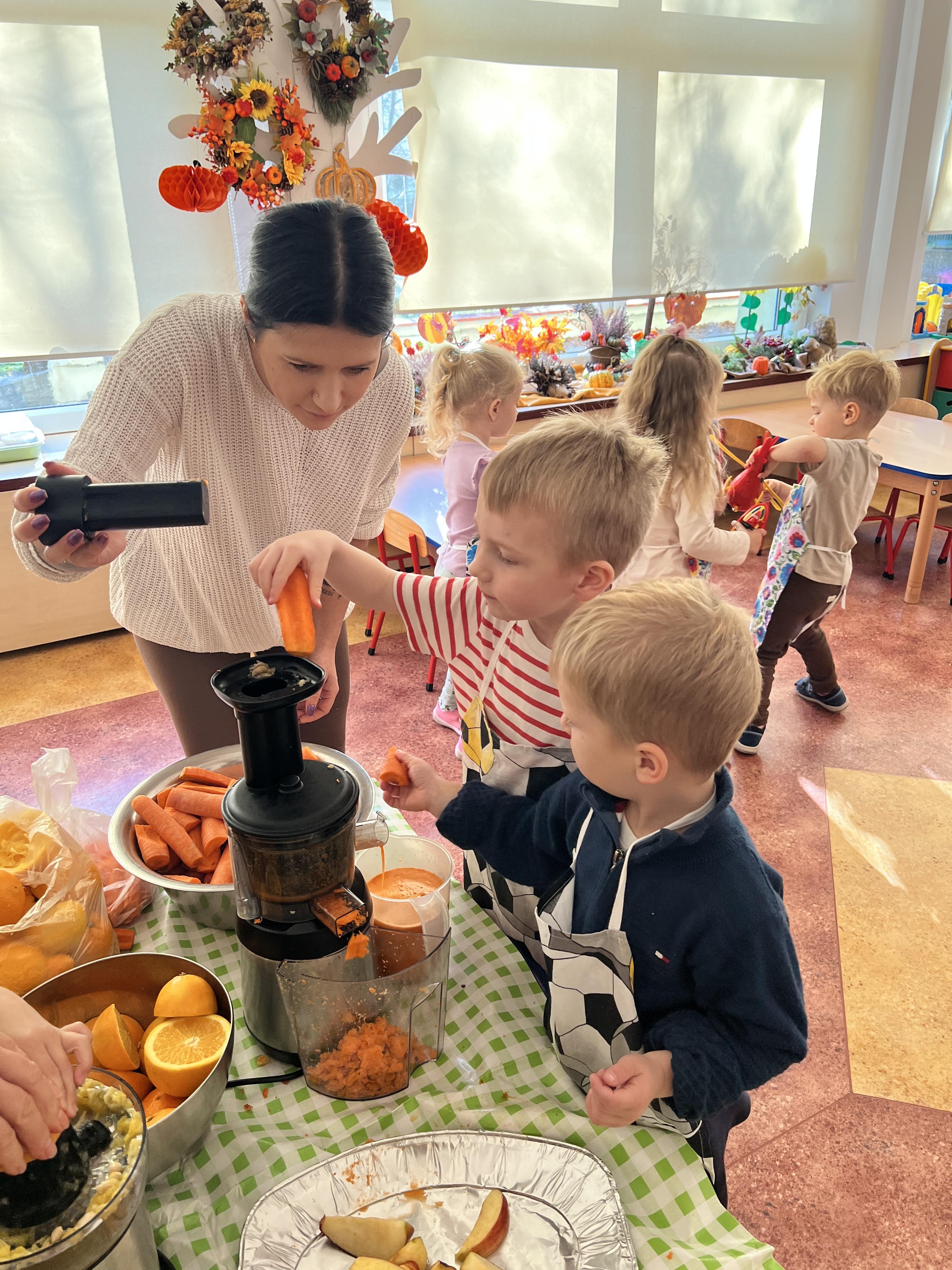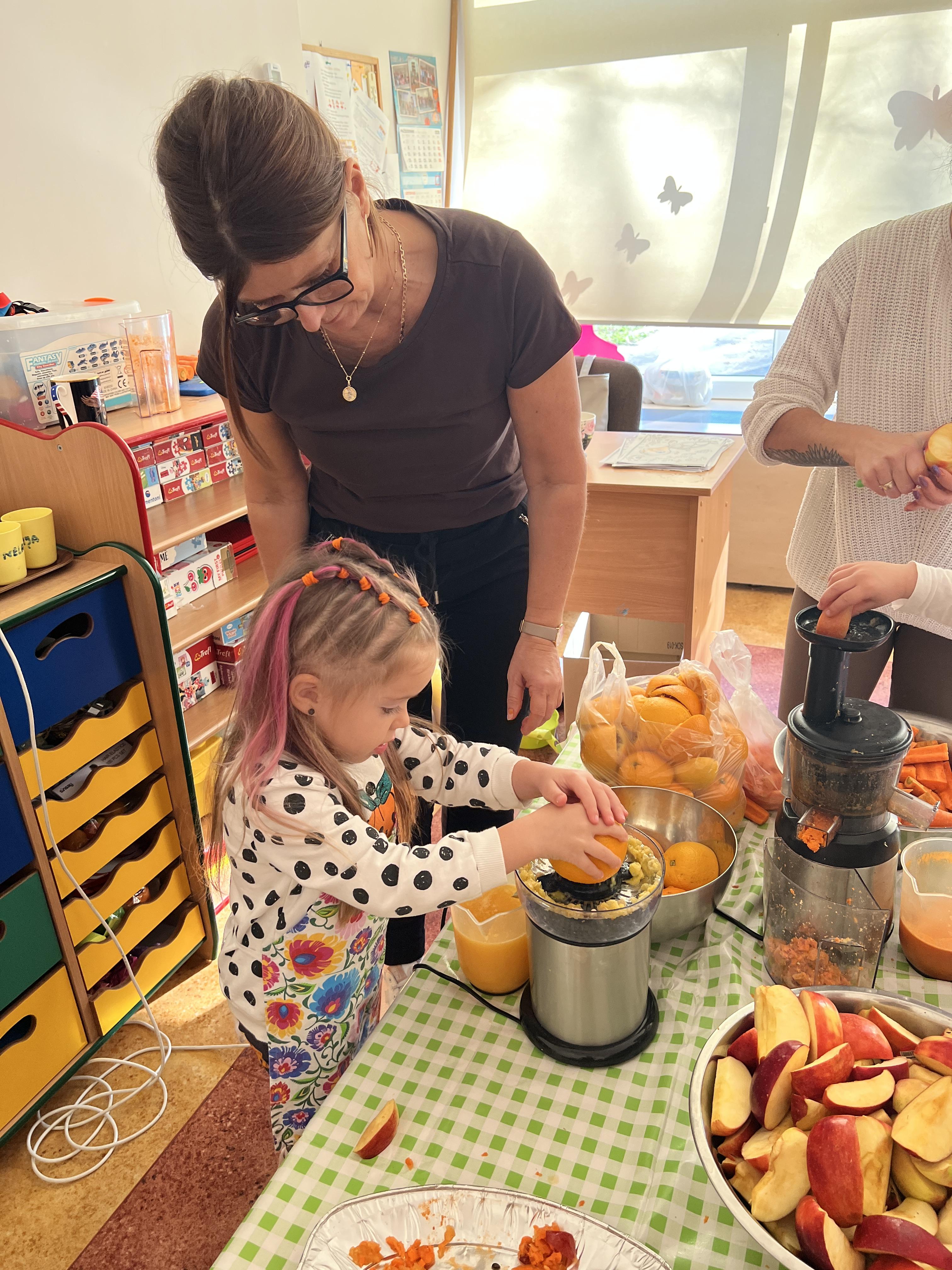 Z myślą o pysznych witaminkach, postanowiliśy sprawdzić jak wyczarować pyszny sok z owoców bez dodatku cukru i konserwantów. Jednak zanim przystąpiliśmy do pracy, przedszkolaki zapoznały się z urządzeniem do robienia soku – sokowirówką, jego działaniem oraz utrwaliły podstawowe zasady higieny i bezpieczeństwa. Następnie dzieci samodzielnie wyciskały sok. Po skończonej pracy delektowały się jego smakiem. Bardzo dziękujemy mamie Mai za wspólnie spędzony czas. Zachęcamy i zapraszamy wszystkich rodziców do odwiedzin