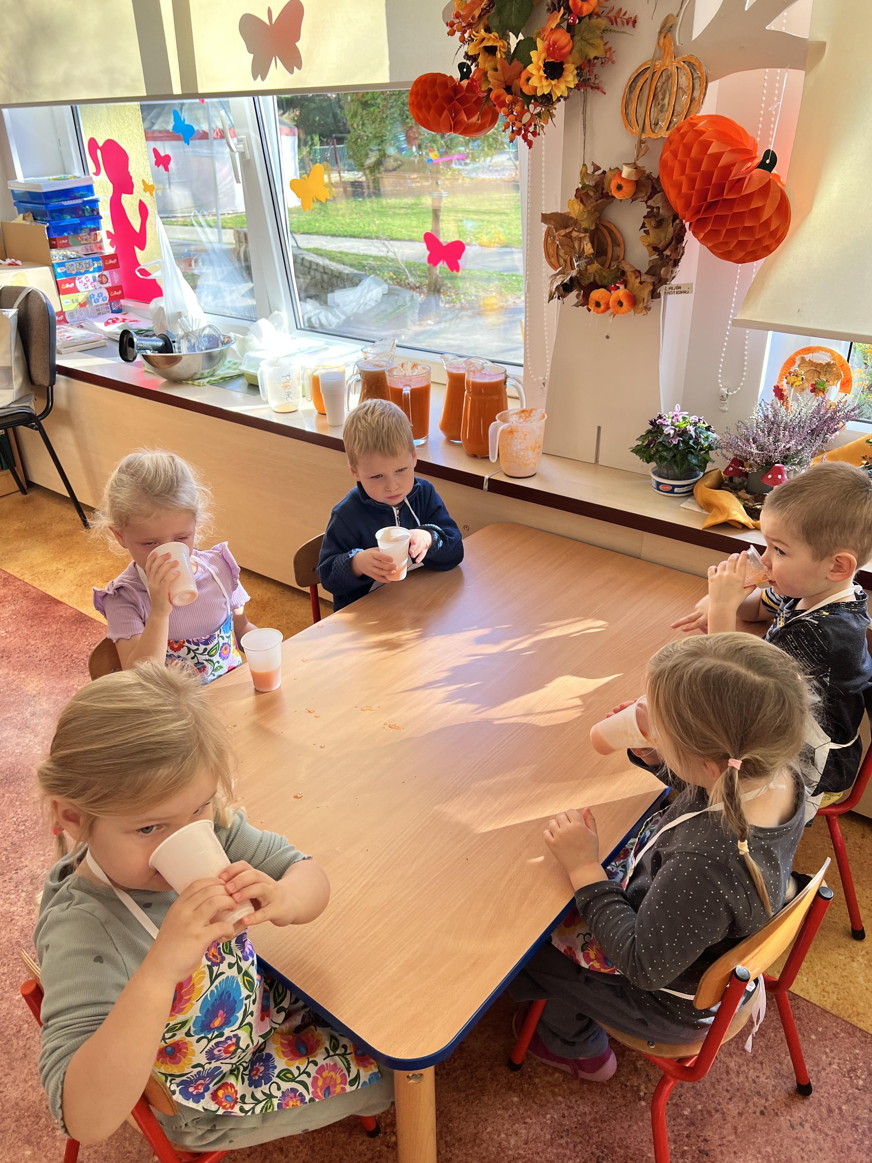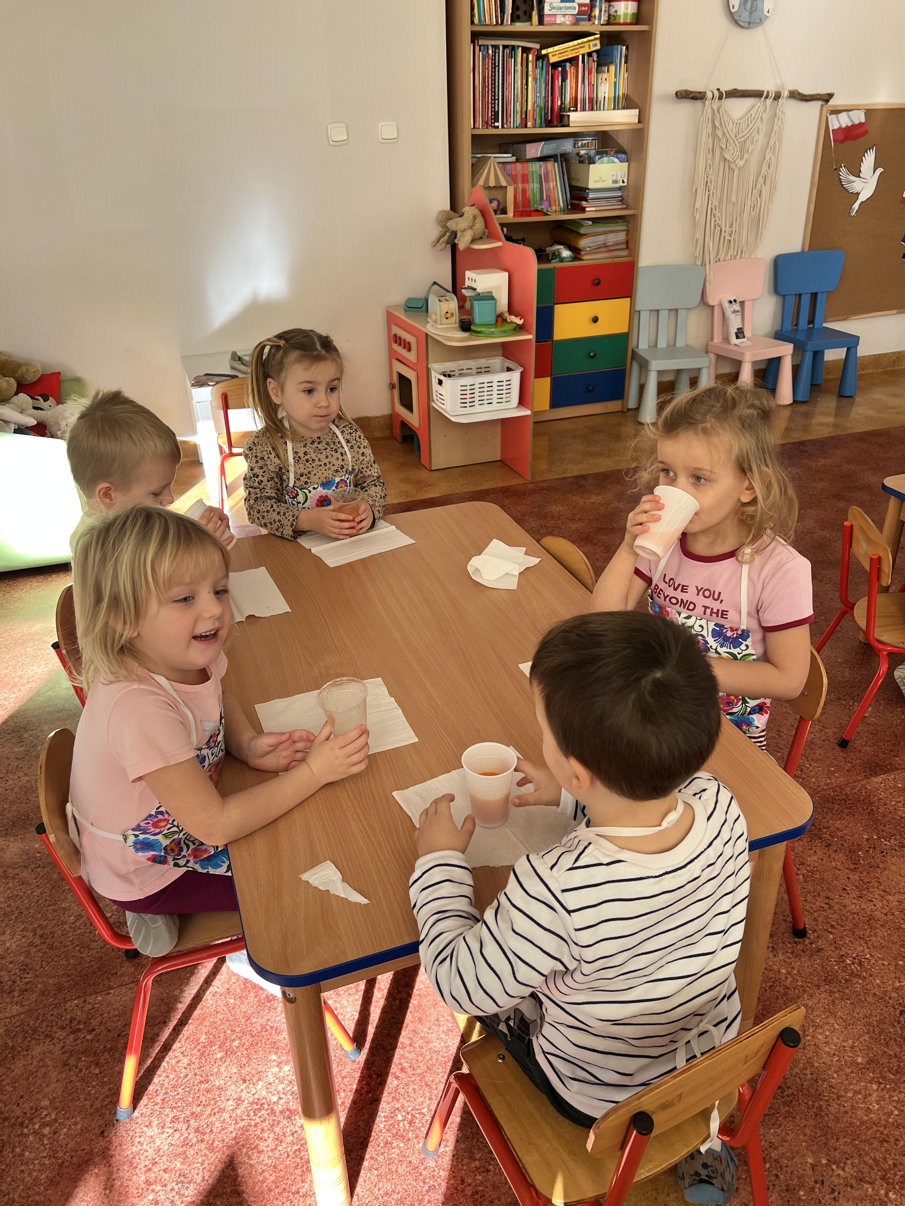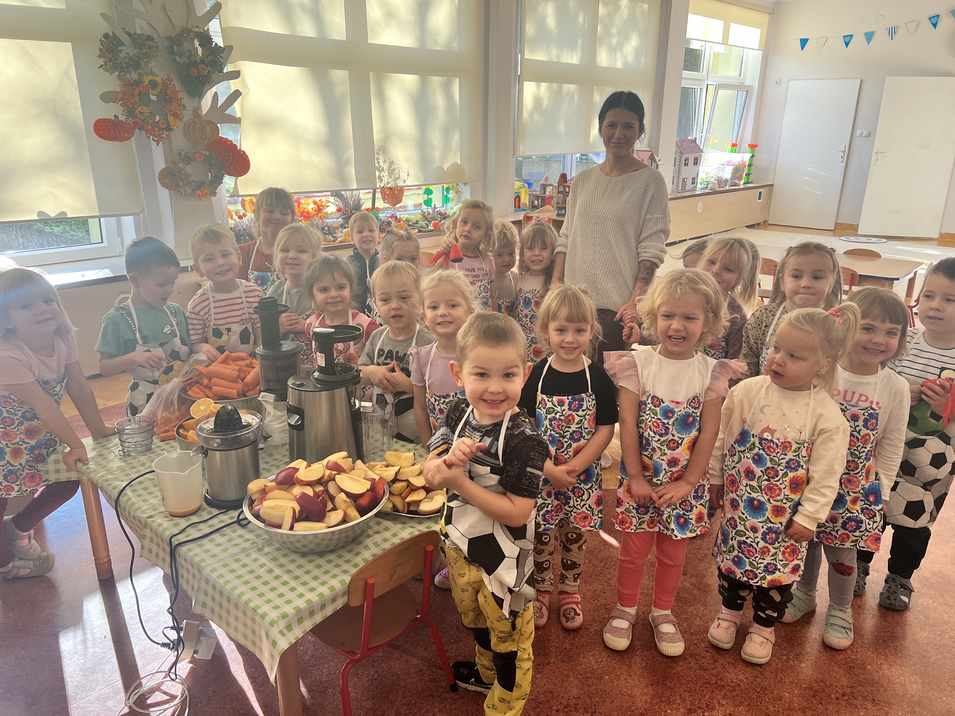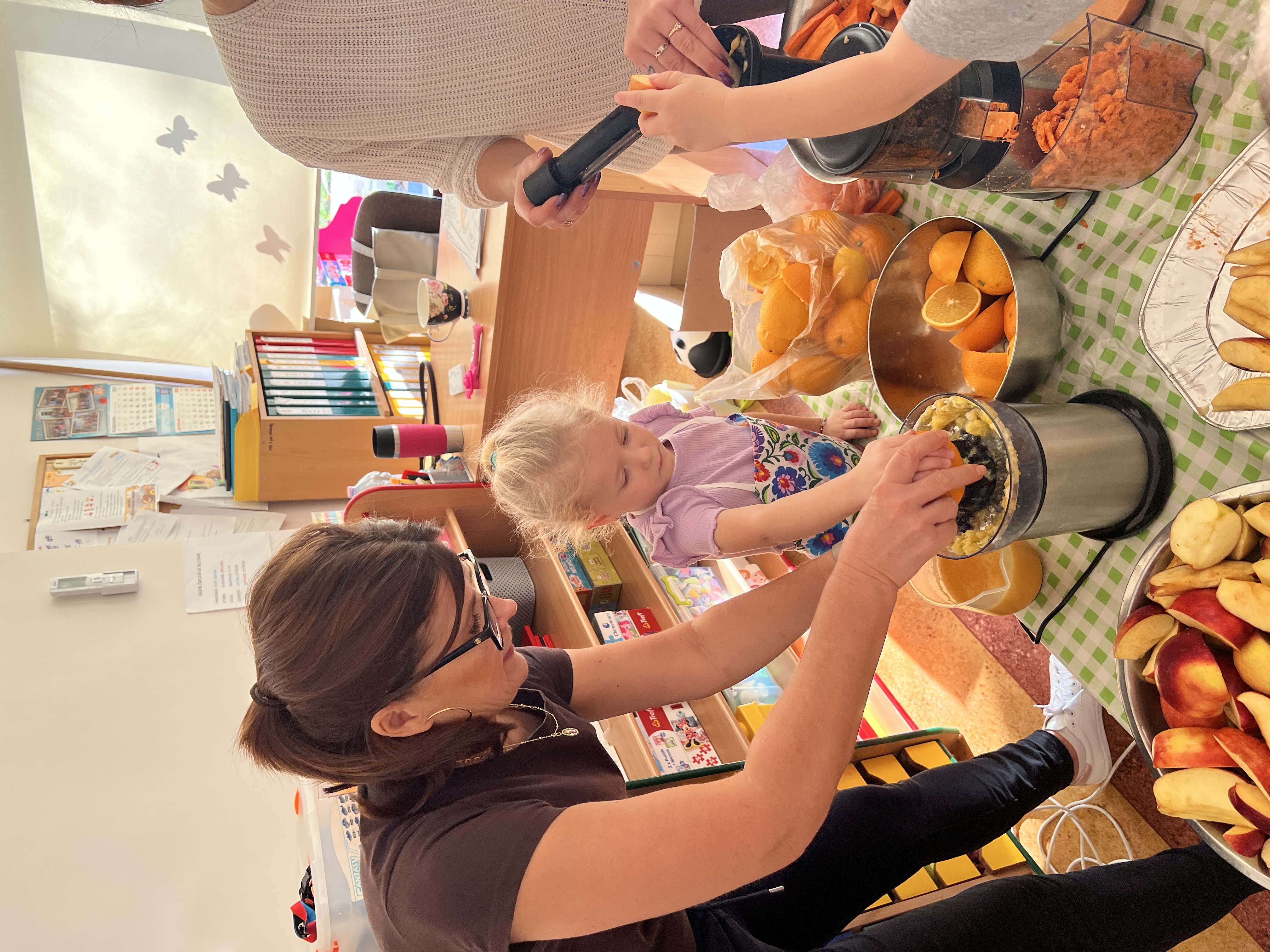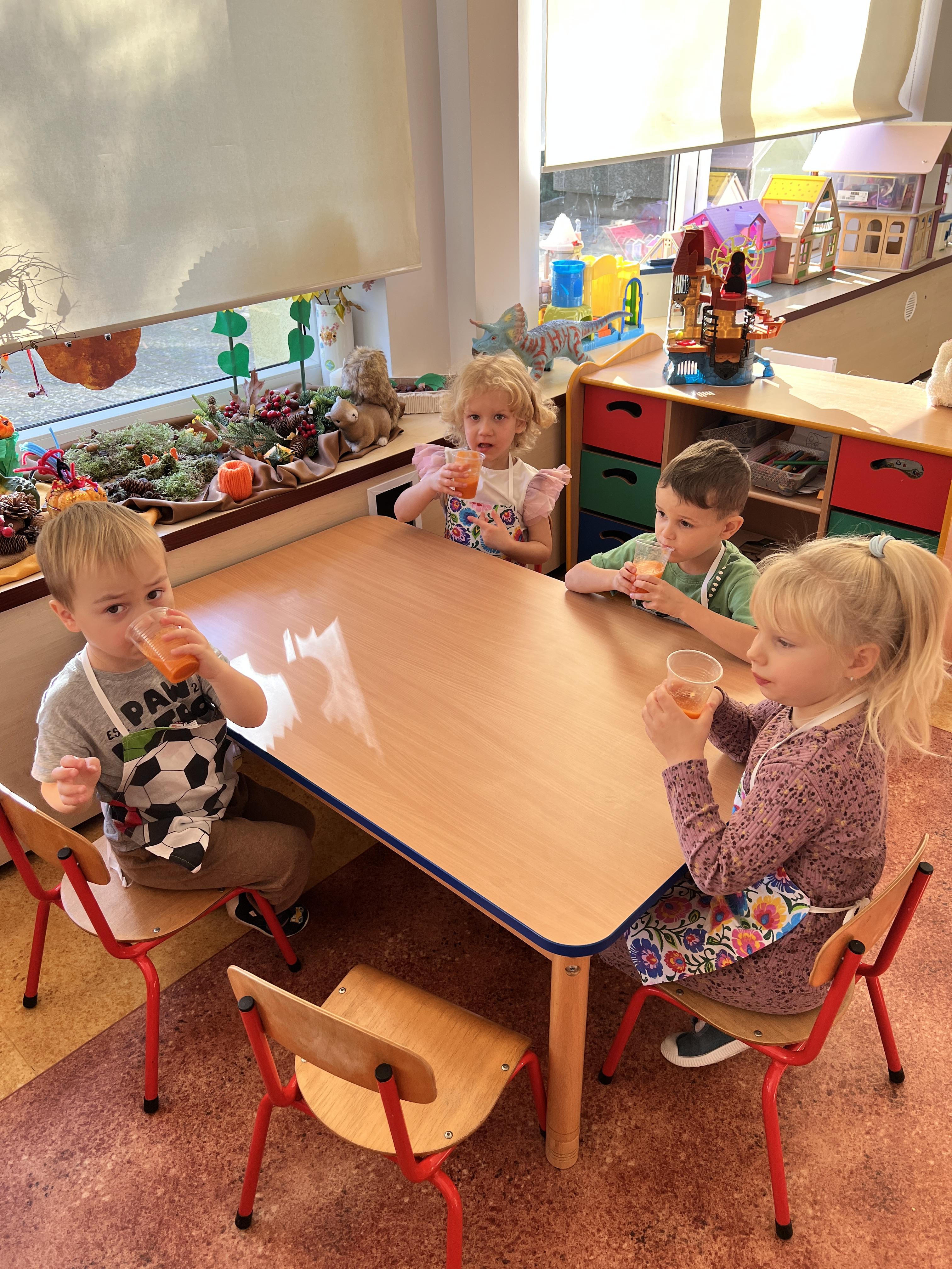 Z myślą o pysznych witaminkach, postanowiliśy sprawdzić jak wyczarować pyszny sok z owoców bez dodatku cukru i konserwantów. Jednak zanim przystąpiliśmy do pracy, przedszkolaki zapoznały się z urządzeniem do robienia soku – sokowirówką, jego działaniem oraz utrwaliły podstawowe zasady higieny i bezpieczeństwa. Następnie dzieci samodzielnie wyciskały sok. Po skończonej pracy delektowały się jego smakiem. Bardzo dziękujemy mamie Mai za wspólnie spędzony czas. Zachęcamy i zapraszamy wszystkich rodziców do odwiedzin